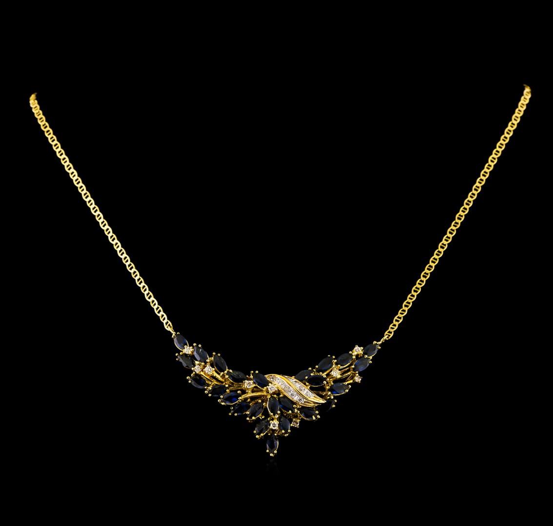 electronically tested 14KT yellow gold ladies cast & assembled sapphire and diamond cluster ensemble. The ensemble includes a sapphire and diamond necklace, cluster ring and a matching pair of earrings. The necklace features a two and one-quarter inch long garland of sapphires with diamond ribbon accents and dispersed diamonds transitioning into a fourteen inch length designer style chain, terminating in a lobster claw clasp. The ring features a tiered sapphire cluster with diamond accents, supported by a two millimeter wide grooved band. The ensemble is completed by a pair of earrings, each featuring a bouquet of sapphires with diamond accents. Bright polish finish with rhodium accents. Identified with markings of "14K". Condition is good. Containing: Twenty-seven prong set marquise mixed cut natural blue sapphires, measuring 5.75 x 3.00 x 1.95mm, approximate. Total Weight of 7.02ct., clarity is eye clean, type II, medium dark, very slightly grayish, blue color, (GIA B 6/3), cut is good. Transmitting light with no distortion, transparent. Measurements & the color grade are an average for the group. Graded in the setting. Thirty-six prong set marquise mixed cut natural blue sapphires, measuring 4.25 x 2.50 x 1.63mm, approximate. Total Weight of 4.68ct., clarity is eye clean, type II, dark, moderately strong, blue color, (GIA B 7/4), cut is good. Transmitting light with no distortion, transparent. Measurements & the color grade are an average for the group. Graded in the setting. Forty-Five prong set round brilliant cut diamonds approximate. Total Weight of 45 Stones = 0.97ct. Graded in the setting. Clarity: SI-1 to I-1. Color: G - I. Total Weight of Colored Stones 11.70ct. Total Weight of Diamonds 0.97ct. Total Weight of Ensemble 30.74gm. AIG Appraised at $12,485.00.