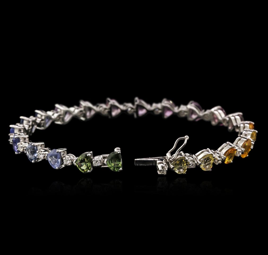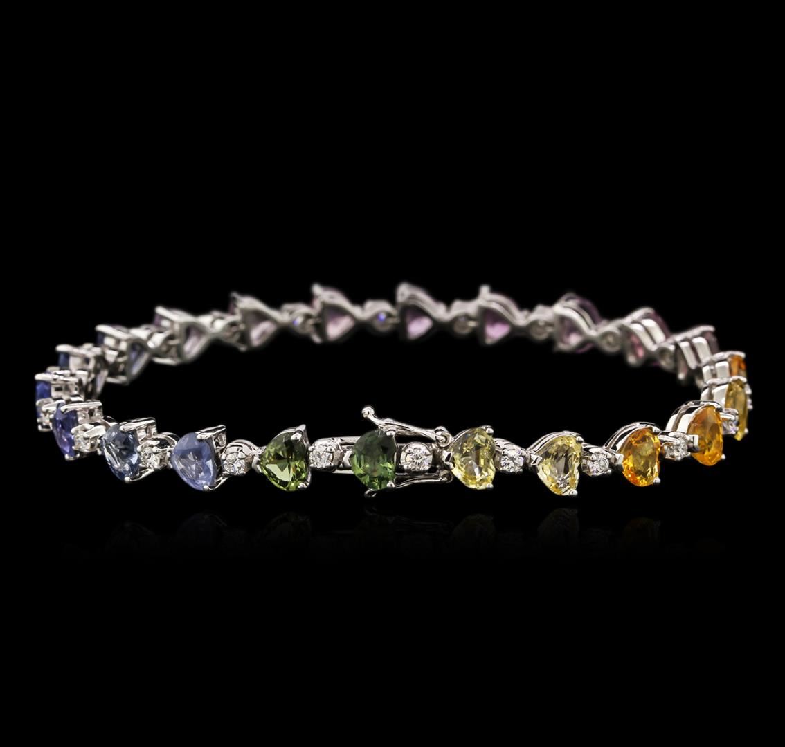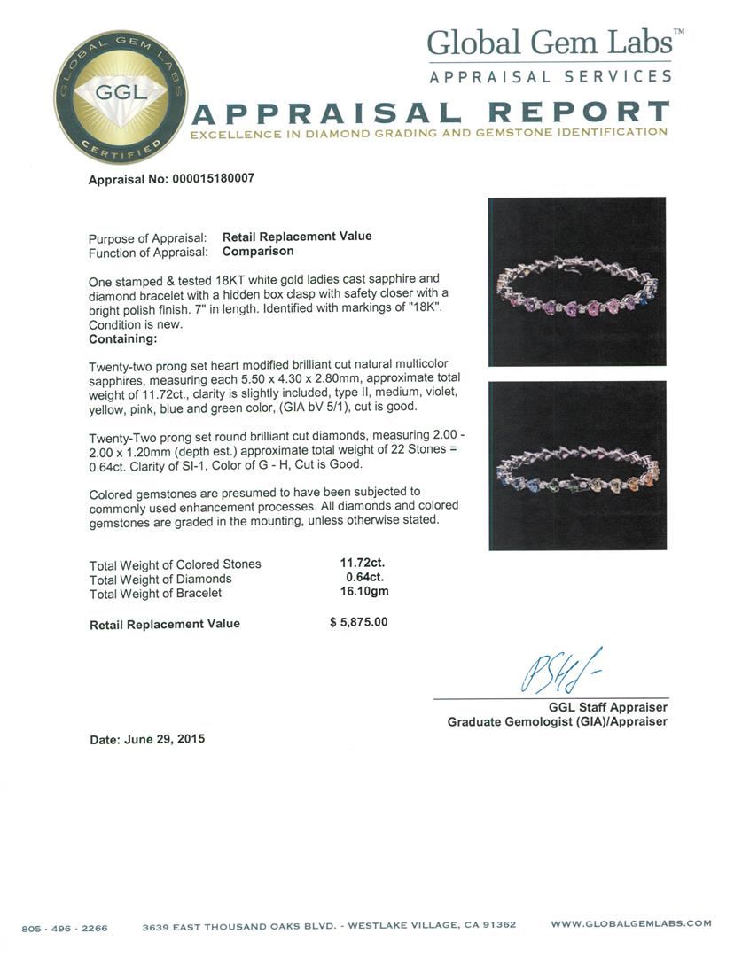 One stamped & tested 18KT white gold ladies cast sapphire and diamond bracelet with a hidden box clasp with safety closer with a bright polish finish. 7" in length. Identified with markings of "18K". Condition is new. Containing: Twenty-two prong set heart modified brilliant cut natural blue sapphires, measuring 5.50 x 4.30 x 2.80mm, approximate total weight of 11.72ct., clarity is slightly included, type II, medium, violet, yellow, pink,blue and green color, (GIA bV 5/1), cut is good. Twenty-Two prong set round brilliant cut diamonds, measuring 2.00 - 2.00 x 1.20mm (depth est.) approximate total weight of 22 Stones = 0.64ct. Clarity: SI-1. Color: G - H, Cut is Good. Colored gemstones are presumed to have been subjected to commonly used enhancement processes. All diamonds and colored gemstones are graded in the mounting, unless otherwise stated. Total Weight of Colored Stones 11.72ct. Total Weight of Diamonds 0.64ct. Total Weight of Bracelet 16.10 grams. GGL Appraised at $5,875.00.