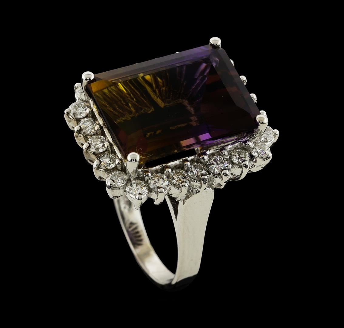 One electronically tested 14KT white gold lady's cast fashion ring with a cathedral shank with a basket halo with a bright polish finish. The featured lady's ring has a shank measuring 2.30 millimeters wide. Identified with markings of '14K'. Condition is new, good workmanship. Containing: One prong set emerald standard step cut natural ametrine quartz, measuring 16.25 x 12.35 x 8.25mm, (depth est.) approximate weight of 11.78ct., clarity is eye clean, medium dark, moderately strong, purple color, (GIA P 6/4) to medium light, moderately strong, orangy yellow, (GIA oY 4/4), cut is very good. Transmitting light with no distortion, transparent. Indications of laboratory high temperature heat treatment. Colored gemstones are presumed to have been subjected to commonly used enhancement processes. Graded in the setting. Twenty-Four prong set round brilliant cut diamonds, measuring 2.30 - 2.20 x 1.35mm (depth est.) approximate total weight of 24 Stones = 1.00ct. Graded in the setting. Clarity SI-1 to I-1. Color: F - G Cut Good. Total Weight of Colored Stones 11.78ct.. Total Weight of Diamonds 1.00ct.. Total Weight of Ring 9.90gm. GAS Appraised at $4,195.00.