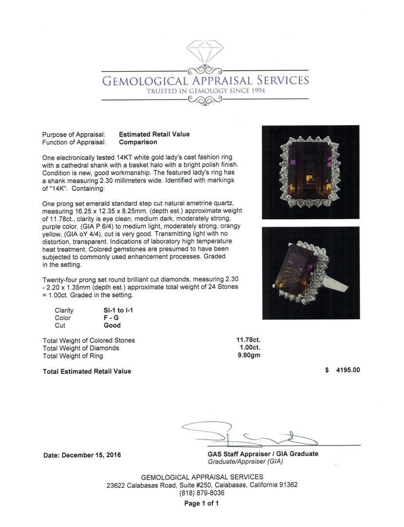 One electronically tested 14KT white gold lady's cast fashion ring with a cathedral shank with a basket halo with a bright polish finish. The featured lady's ring has a shank measuring 2.30 millimeters wide. Identified with markings of '14K'. Condition is new, good workmanship. Containing: One prong set emerald standard step cut natural ametrine quartz, measuring 16.25 x 12.35 x 8.25mm, (depth est.) approximate weight of 11.78ct., clarity is eye clean, medium dark, moderately strong, purple color, (GIA P 6/4) to medium light, moderately strong, orangy yellow, (GIA oY 4/4), cut is very good. Transmitting light with no distortion, transparent. Indications of laboratory high temperature heat treatment. Colored gemstones are presumed to have been subjected to commonly used enhancement processes. Graded in the setting. Twenty-Four prong set round brilliant cut diamonds, measuring 2.30 - 2.20 x 1.35mm (depth est.) approximate total weight of 24 Stones = 1.00ct. Graded in the setting. Clarity SI-1 to I-1. Color: F - G Cut Good. Total Weight of Colored Stones 11.78ct.. Total Weight of Diamonds 1.00ct.. Total Weight of Ring 9.90gm. GAS Appraised.