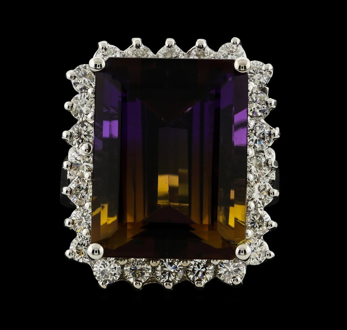 One electronically tested 14KT white gold lady's cast fashion ring with a cathedral shank with a basket halo with a bright polish finish. The featured lady's ring has a shank measuring 2.30 millimeters wide. Identified with markings of '14K'. Condition is new, good workmanship. Containing: One prong set emerald standard step cut natural ametrine quartz, measuring 16.25 x 12.35 x 8.25mm, (depth est.) approximate weight of 11.78ct., clarity is eye clean, medium dark, moderately strong, purple color, (GIA P 6/4) to medium light, moderately strong, orangy yellow, (GIA oY 4/4), cut is very good. Transmitting light with no distortion, transparent. Indications of laboratory high temperature heat treatment. Colored gemstones are presumed to have been subjected to commonly used enhancement processes. Graded in the setting. Twenty-Four prong set round brilliant cut diamonds, measuring 2.30 - 2.20 x 1.35mm (depth est.) approximate total weight of 24 Stones = 1.00ct. Graded in the setting. Clarity SI-1 to I-1. Color: F - G Cut Good. Total Weight of Colored Stones 11.78ct.. Total Weight of Diamonds 1.00ct.. Total Weight of Ring 9.90gm. GAS Appraised.