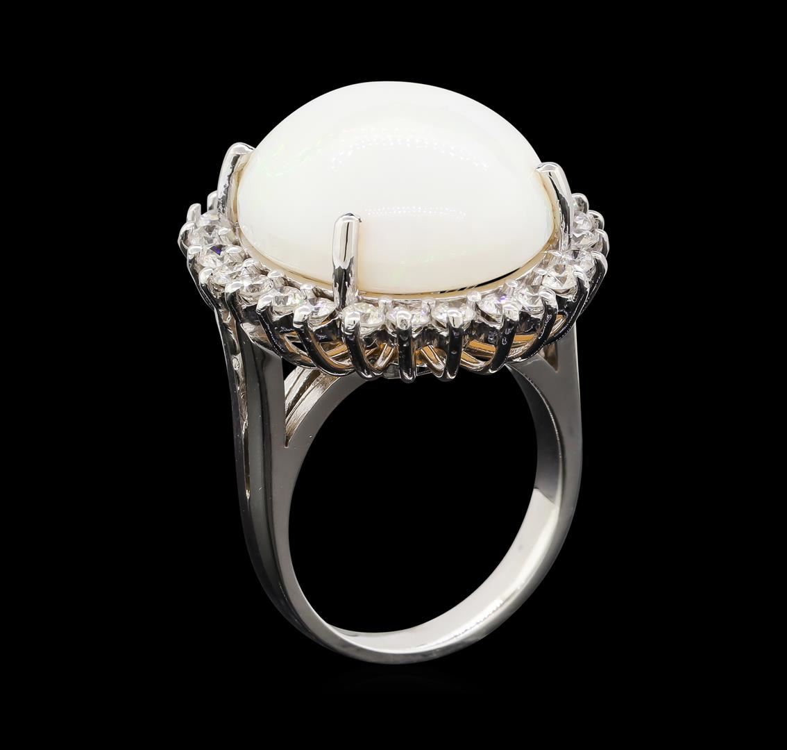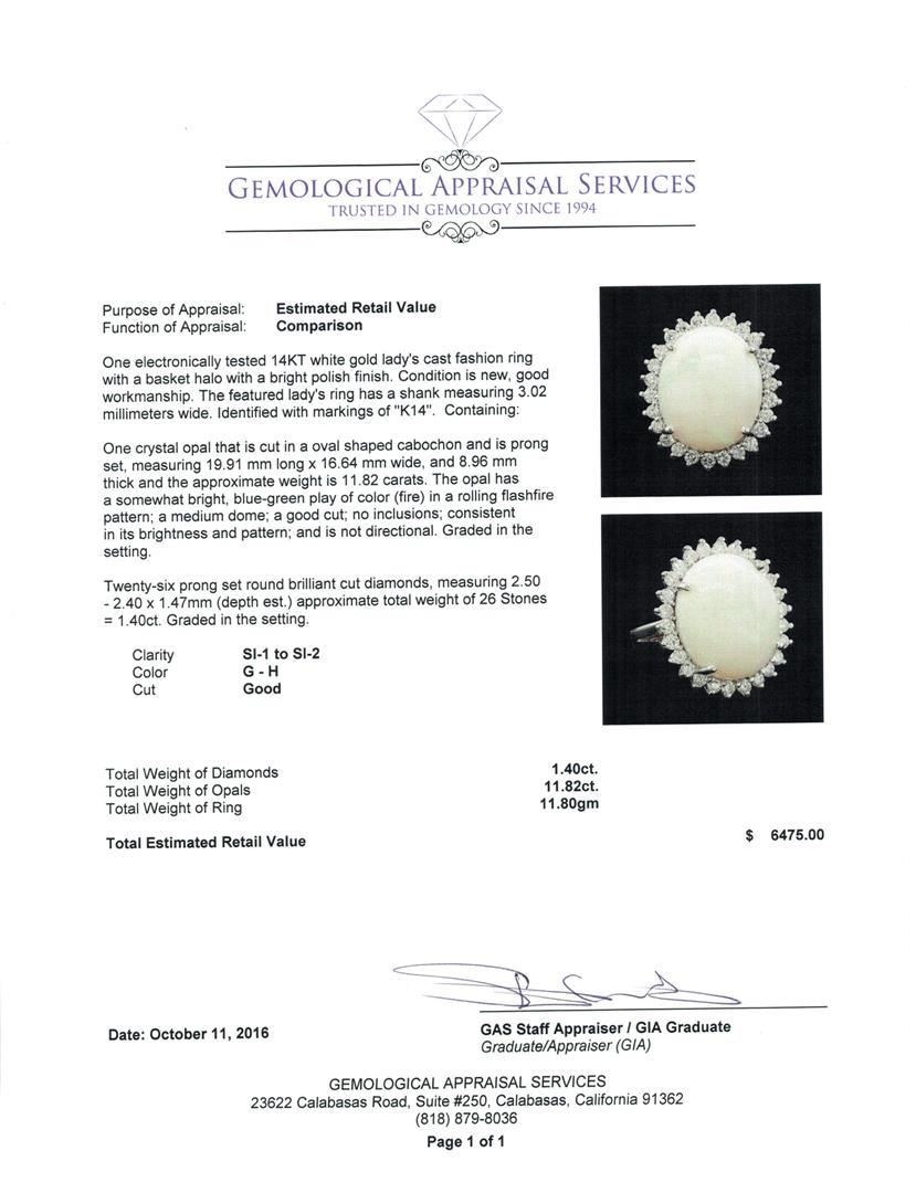 One electronically tested 14KT white gold lady's cast fashion ring with a basket halo with a bright polish finish. The featured lady's ring has a shank measuring 3.02 millimeters wide. Identified with markings of 'K14'. Condition is new, good workmanship. Containing: One crystal opal that is cut in a oval shaped cabochon and is prong set, measuring 19.91 mm long x 16.64 mm wide, and 8.96 mm thick and the approximate weight is 11.82 carats. The opal has a somewhat bright, blue-green play of color (fire) in a rolling flashfire pattern; a medium dome; a good cut; no inclusions; consistent in its brightness and pattern; and is not directional. Graded in the setting. Twenty-Six prong set round brilliant cut diamonds, measuring 2.50 - 2.40 x 1.47mm (depth est.) approximate total weight of 26 Stones = 1.40ct. Graded in the setting. Clarity SI-1 to SI-2. Color: G - H Cut Good. Total Weight of Diamonds 1.40ct.. Total Weight of Opals 11.82ct.. Total Weight of Ring 11.80gm. GAS Appraised at $6,475.00.