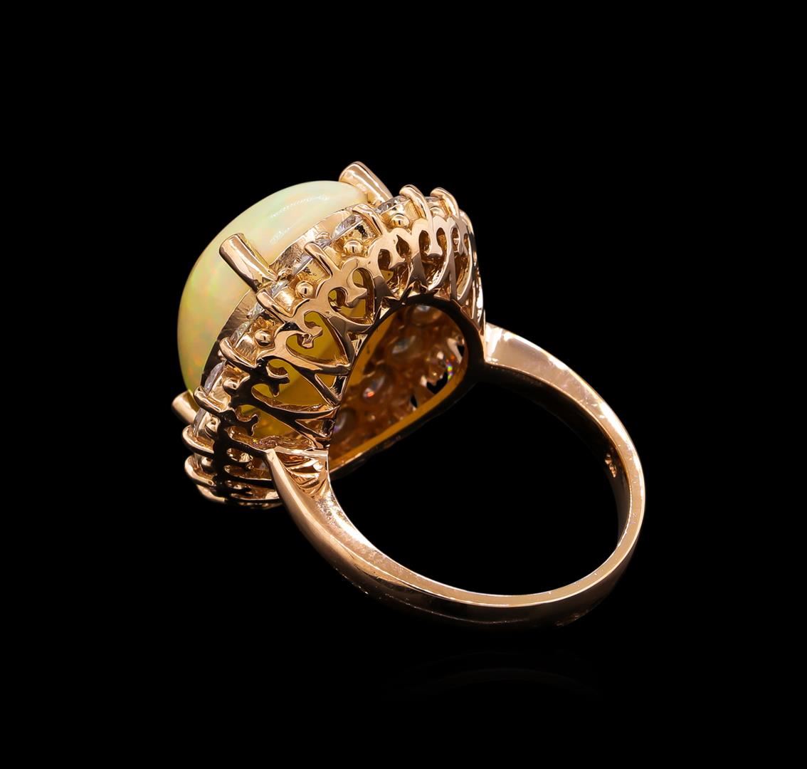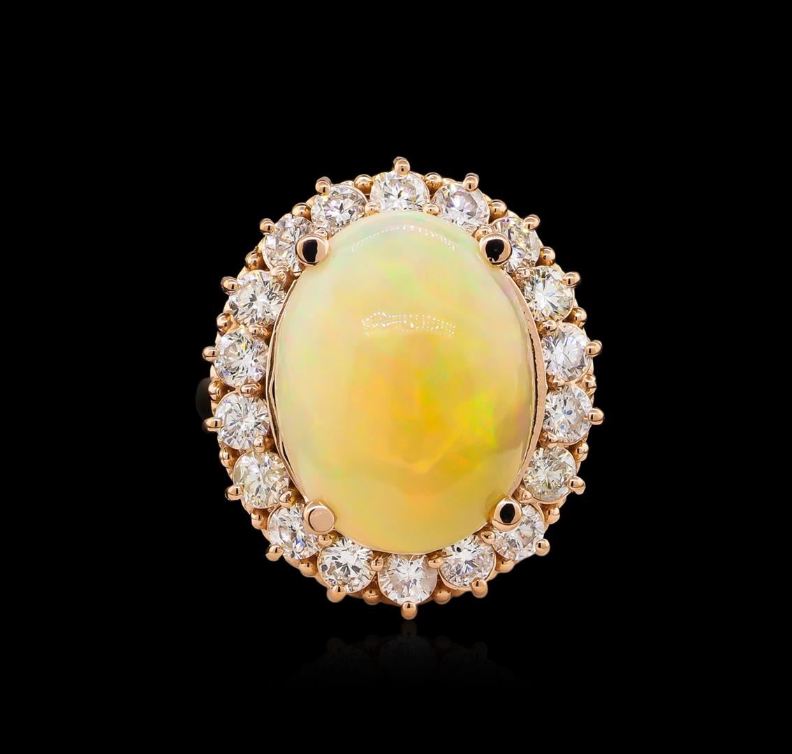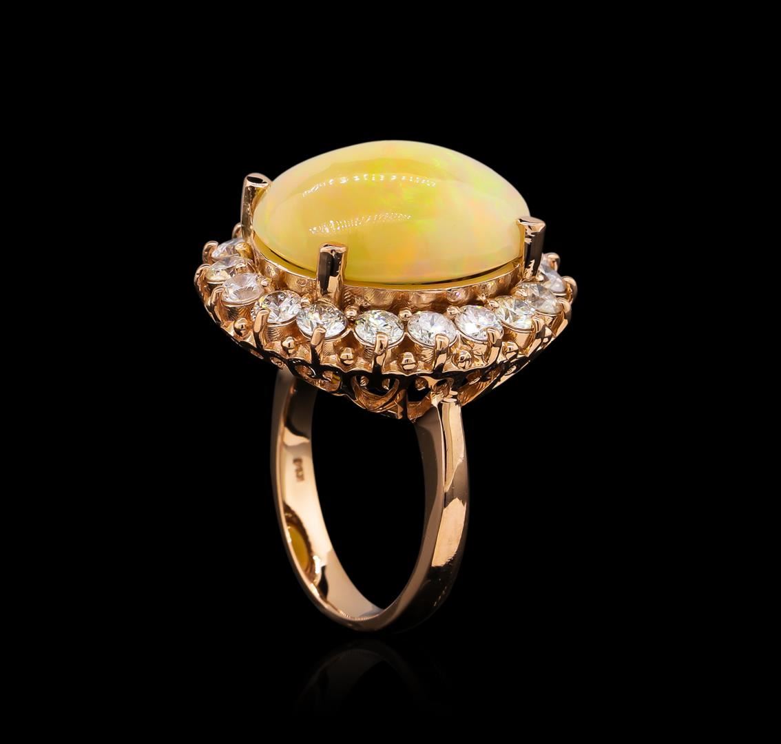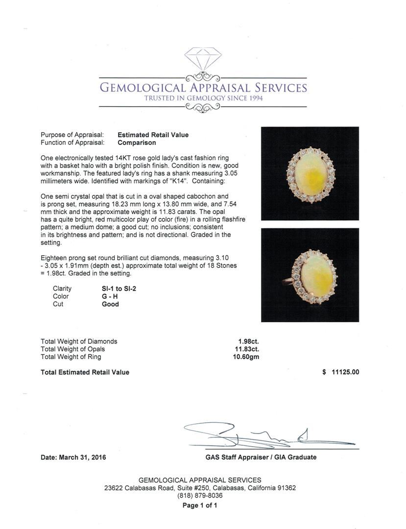 One electronically tested 14KT rose gold lady's cast fashion ring with a basket halo with a bright polish finish. The featured lady's ring has a shank measuring 3.05 millimeters wide. Identified with markings of "K14". Condition is new, good workmanship. Containing: One semi crystal opal that is cut in a oval shaped cabochon and is prong set, measuring 18.23 mm long x 13.80 mm wide, and 7.54 mm thick and the approximate weight is 11.83 carats. The opal has a quite bright, red multicolor play of color (fire) in a rolling flashfire pattern; a medium dome; a good cut; no inclusions; consistent in its brightness and pattern; and is not directional. Graded in the setting. Eighteen prong set round brilliant cut diamonds, measuring 3.10 - 3.05 x 1.91mm (depth est.) approximate total weight of 18 Stones = 1.98ct. Graded in the setting. Clarity: SI-1 to SI-2. Color: G - Good. Total Weight of Diamonds 1.98ct. Total Weight of Opals 11.83ct. Total Weight of Ring 10.60gm GAS Appraised.
