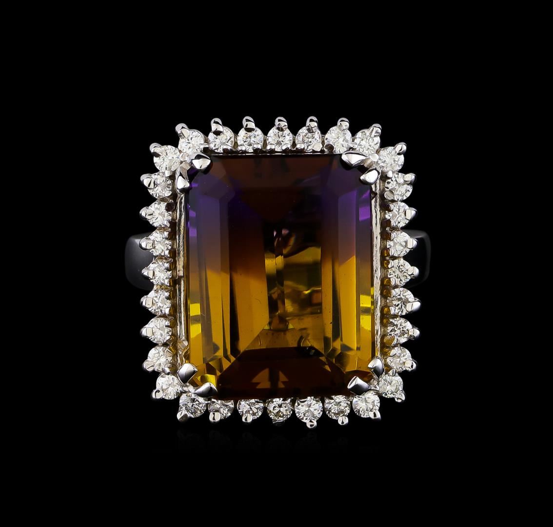 One electronically tested 14KT white gold lady's cast fashion ring with a basket halo with a bright polish finish. The featured lady's ring has a shank measuring 2.89 millimeters in width. Identified with markings of "14K". Condition is new, good workmanship. Containing: One prong set emerald step cut natural ametrine quartz, measuring 16.22 x 12.32 x 8.05mm, (depth est.) approximate weight of 11.85ct., clarity is eye clean, medium, moderately strong, purple color, (GIA P 5/4) to medium, moderately strong, yellowish orange, (GIA yO 5/4), cut is very good. Transmitting light with no distortion, transparent. Colored gemstones are presumed to have been subjected to commonly used enhancement processes. Graded in the setting. Thirty-Two prong set round brilliant cut diamonds, measuring 1.80 - 1.70 x 1.09mm (depth est.) approximate total weight of 32 Stones = 0.65ct. Graded in the setting. Clarity: SI-1 to SI-2. Color: H - I. Cut Good. Total Weight of Colored Stones 11.85ct. Total Weight of Diamonds 0.65ct. Total Weight of Ring 11.50gm. GAS Appraised at $3,825.00.