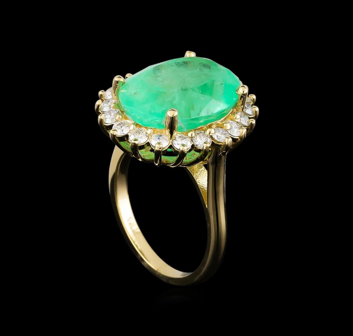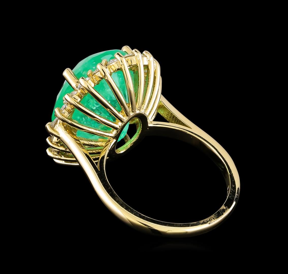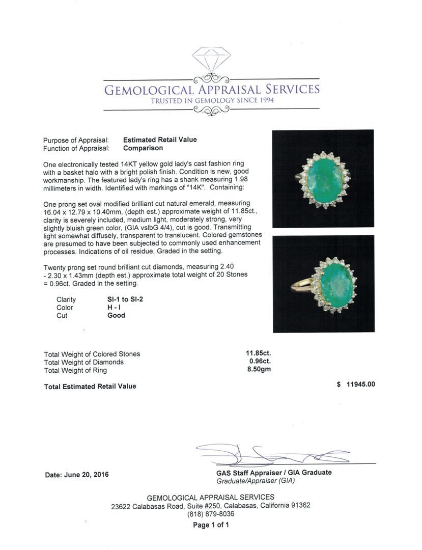One electronically tested 14KT yellow gold lady's cast fashion ring with a basket halo with a bright polish finish. The featured lady's ring has a shank measuring 1.98 millimeters in width. Identified with markings of "14K". Condition is new, good workmanship. Containing: One prong set oval modified brilliant cut natural emerald, measuring 16.04 x 12.79 x 10.40mm, (depth est.) approximate weight of 11.85ct., clarity is severely included, medium light, moderately strong, very slightly bluish green color, (GIA vslbG 4/4), cut is good. Transmitting light somewhat diffusely, transparent to translucent. Colored gemstones are presumed to have been subjected to commonly used enhancement processes. Indications of oil residue. Graded in the setting. Twenty prong set round brilliant cut diamonds, measuring 2.40 - 2.30 x 1.43mm (depth est.) approximate total weight of 20 Stones = 0.96ct. Graded in the setting. Clarity: SI-1 to SI-2. Color: H - I. Cut Good. Total Weight of Colored Stones 11.85ct. Total Weight of Diamonds 0.96ct. Total Weight of Ring 8.50gm GAS Appraised at $11,945.00.