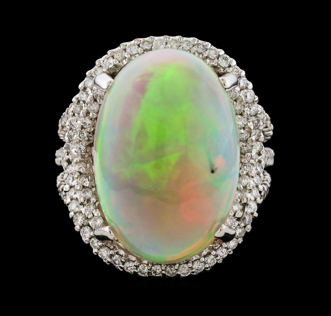 One electronically tested 14KT white gold lady's cast fashion ring with a triple split shank with a bright polish finish. The featured lady's ring has a cathedral triple shank measuring 4.32 millimeters wide. Identified with markings of '14K'. Condition is new, good workmanship. Containing: One crystal opal that is cut in a oval shaped cabochon and is prong set, measuring 19.59 mm long x 13.35 mm wide, and 9.10 mm thick and the approximate weight is 11.85 carats. The opal has a somewhat bright, multicolor play of color (fire) in a rolling flashfire pattern; a high dome; a good cut; slightly included; consistent in its brightness and pattern; and is not directional. Graded in the setting. One Hundred Sixty prong set round brilliant cut diamonds, measuring 1.30 - 1.25 x 0.79mm (depth est.) approximate total weight of 160 Stones = 1.25ct. Graded in the setting. Clarity SI-1 to I-2. Color: G - H Cut Good. Total Weight of Diamonds 1.25ct.. Total Weight of Opals 11.85ct.. Total Weight of Ring 10.70gm. GAS Appraised at $8,100.00.