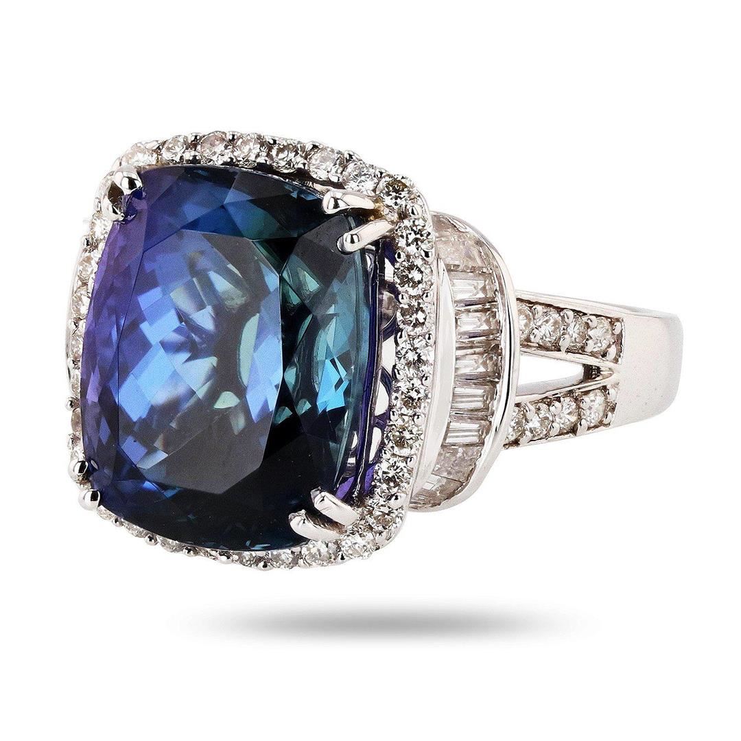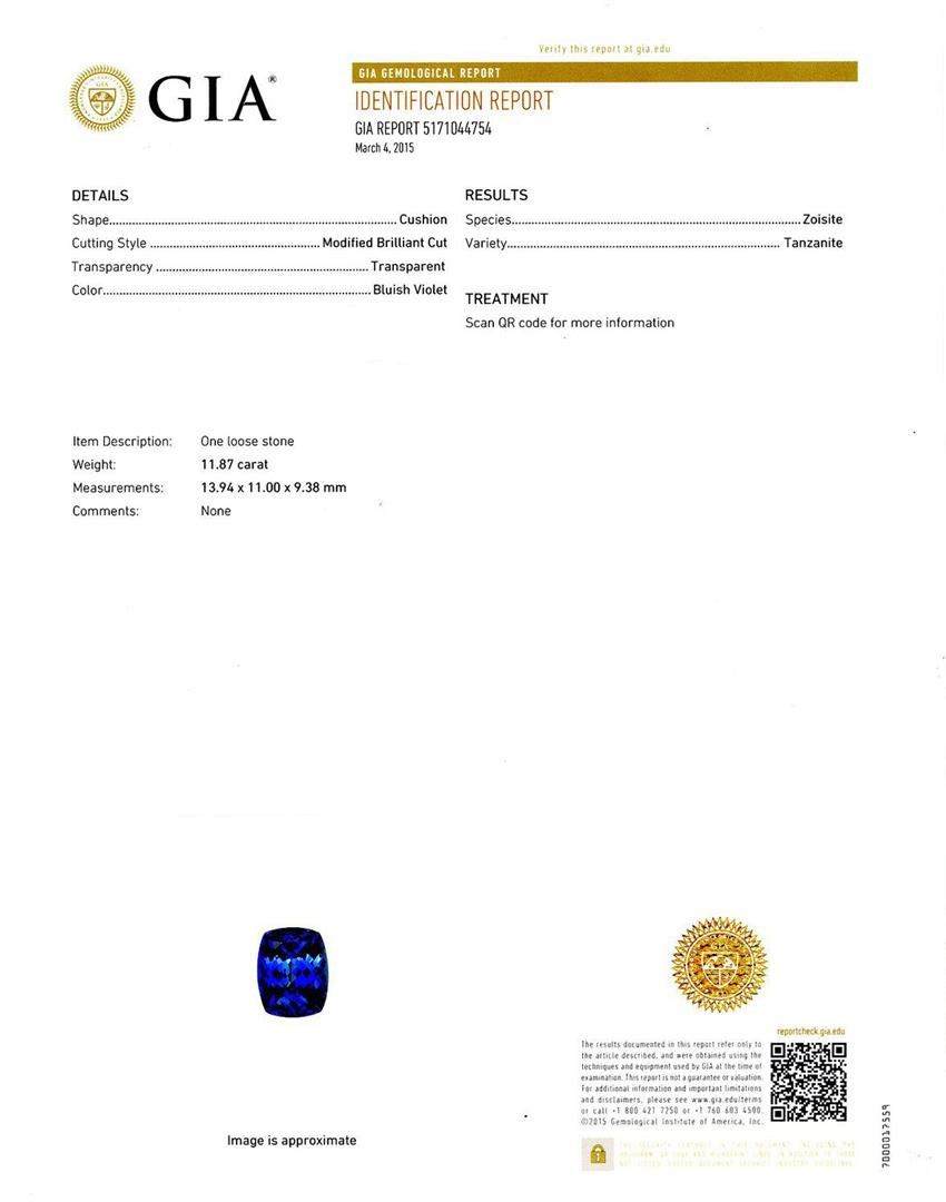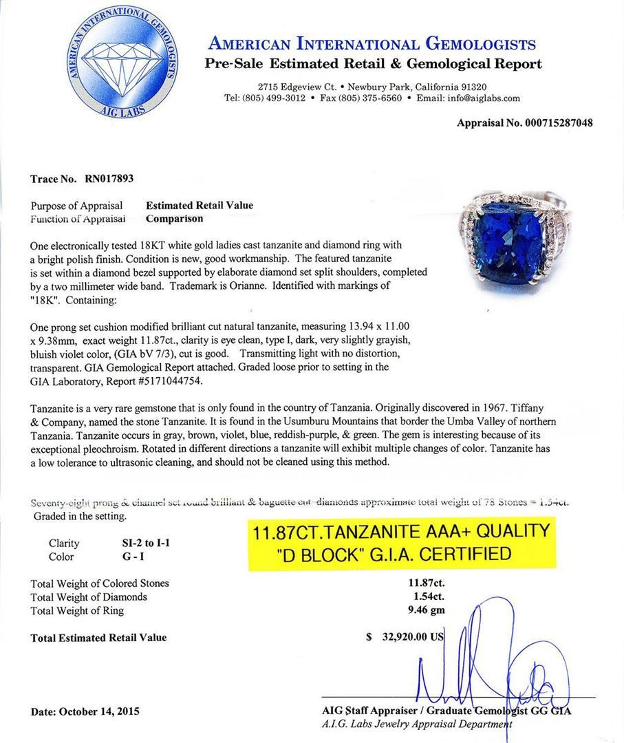 11.87ct DARK Tanzanite and 1.54ctw Diamond 18K White Gold Ring (GIA CERTIFIED). One electronically tested 18KT white gold ladies cast tanzanite and diamond ring with a bright polish finish. Condition is new, good workmanship. The featured tanzanite is set within a diamond bezel supported by elaborate diamond set split shoulders, completed by a two millimeter wide band. Trademark is Orianne. Identified with markings of "18K". Containing: One prong set cushion modified brilliant cut natural tanzanite, measuring 13.94mm x 11.00mm x 9.38mm, exact weight 11.87ct., clarity is eye clean, type I, dark, very slightly grayish, bluish violet color, (GIA bV 7/3), cut is good. Transmitting light with no distortion, transparent. GIA Gemological Report attached. Graded loose prior to setting in the GIA Laboratory, Report 5171044754. Tanzanite is a very rare gemstone that is only found in the country of Tanzania. Originally discovered in 1967. Tiffany and Company, named the stone Tanzanite. It is found in the Usumburu Mountains that border the Umba Valley of northern Tanzania. Tanzanite occurs in gray, brown, violet, blue, reddish-purple, and green. The gem is interesting because of its exceptional pleochroism. Rotated in different directions a tanzanite will exhibit multiple changes of color. Tanzanite has a low tolerance to ultrasonic cleaning, and should not be cleaned using this method. Seventy-eight prong and channel set round brilliant and baguette cut diamond approximate total weight of 78 Stones = 1.54ct. Graded in the setting. Clarity SI2 to I1 Color G - I Total Weight of Colored Stones 11.87ct. Total Weight of Diamonds 1.54ct. Total Weight of Ring 9.46 gm