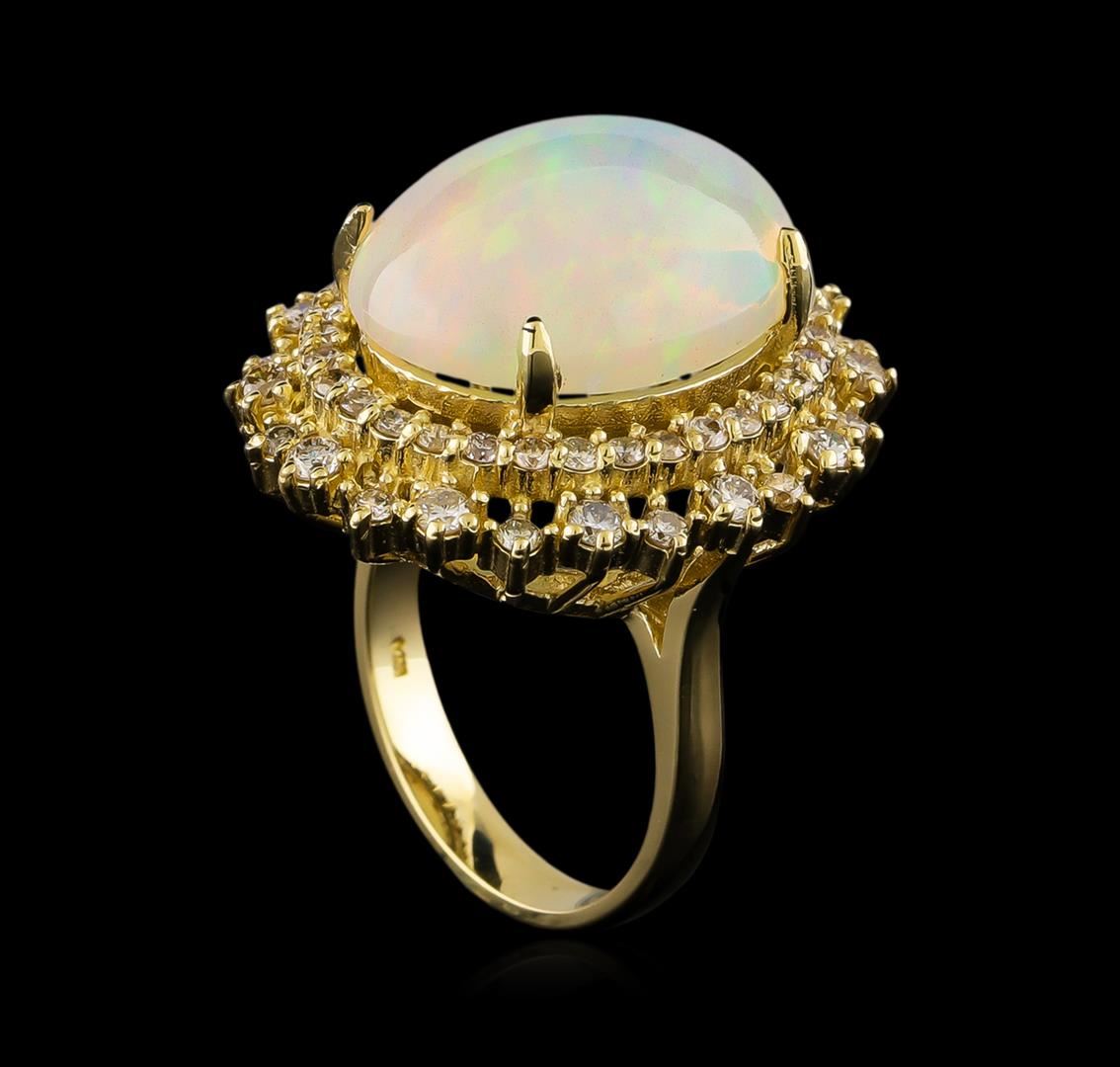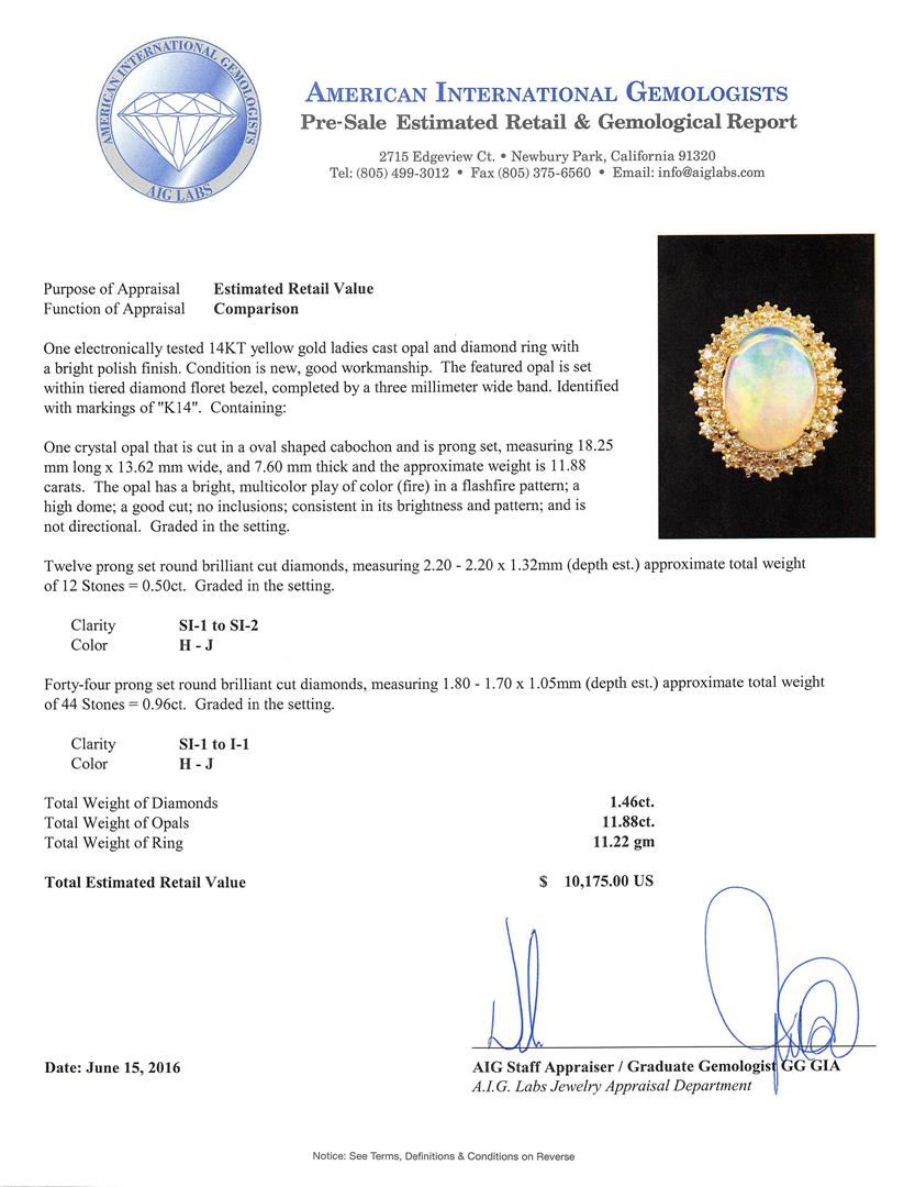 One electronically tested 14KT yellow gold ladies cast opal and diamond ring with a bright polish finish. The featured opal is set within tiered diamond floret bezel, completed by a three millimeter wide band. Identified with markings of "K14". Condition is new, good workmanship. Containing: One crystal opal that is cut in a oval shaped cabochon and is prong set, measuring 18.25 mm long x 13.62 mm wide, and 7.60 mm thick and the approximate weight is 11.88 carats. The opal has a bright, multicolor play of color (fire) in a flashfire pattern; a high dome; a good cut; no inclusions; consistent in its brightness and pattern; and is not directional. Graded in the setting. Twelve prong set round brilliant cut diamonds, measuring 2.20 - 2.20 x 1.32mm (depth est.) approximate total weight of 12 Stones = 0.50ct. Graded in the setting. Clarity: SI-1 to SI-2. Color: H - J Forty-Four prong set round brilliant cut diamonds, measuring 1.80 - 1.70 x 1.05mm (depth est.) approximate total weight of 44 Stones = 0.96ct. Graded in the setting. Clarity: SI-1 to I-1. Color: H - J. Total Weight of Diamonds 1.46ct. Total Weight of Opals 11.88ct. Total Weight of Ring 11.22gm. AIG Appraised at $10,175.00.