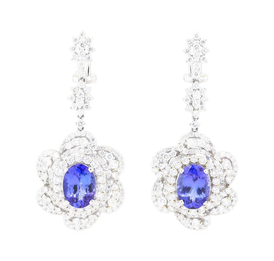 One electronically tested 18KT white gold lady's combination cast & assembled fashion earrings with Omega clip backs with posts with a bright polish finish. The featured lady's earrings have a drop of approximately 49 millimeters. Identified with markings of '18K 750'. Condition is new. Containing: Two prong set oval modified mixed cut natural tanzanites, measuring 10.95 x 8.08 x 5.25mm, (depth est.) approximate total weight of 6.62ct., clarity is eye clean, medium, moderately strong, violetish blue color, (GIA vB 5/4), cut is very good. Transmitting light with no distortion, transparent. Colored gemstones are presumed to have been subjected to commonly used enhancement processes. Graded in the setting. Twelve prong set round brilliant cut diamonds, measuring 2.40 - 2.35 x 1.48mm (depth est.) approximate total weight of 12 Stones = 0.61ct. Graded in the setting. Color H - I Clarity SI-1 to SI-2 Cut Very Good Two Hundred Eighty-Eight prong set round brilliant cut diamonds, measuring 2.00 - 1.30 x 0.99mm (depth est.) approximate total weight of 288 Stones = 4.67ct. Color H - I Clarity SI-1 to SI-2 Cut Very Good. Total Weight of Colored Stones 6.62ct.. Total Weight of Diamonds 5.28ct.. Total Weight of Earrings 15.80gm GAS Appraised at $25120.00. GAS Appraised.