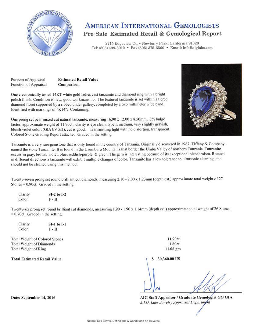One electronically tested 14KT white gold ladies cast tanzanite and diamond ring with a bright polish finish. The featured tanzanite is set within a tiered diamond floret supported by a ribbed under gallery, completed by a two millimeter wide band. Identified with markings of 'K14'. Condition is new, good workmanship. Containing: One prong set pear mixed cut natural tanzanite, measuring 16.90 x 12.00 x 8.50mm, 3%. bulge factor, approximate weight of 11.90ct., clarity is eye clean, type I, medium, very slightly grayish, bluish violet color, (GIA bV 5/3), cut is good. Transmitting light with no distortion, transparent. Colored Stone Grading Report attached. Graded in the setting. Tanzanite is a very rare gemstone that is only found in the country of Tanzania. Originally discovered in 1967. Tiffany & Company, named the stone Tanzanite. It is found in the Usumburu Mountains that border the Umba Valley of northern Tanzania. Tanzanite occurs in gray, brown, violet, blue, reddish-purple, & green. The gem is interesting because of its exceptional pleochroism. Rotated in different directions a tanzanite will exhibit multiple changes of color. Tanzanite has a low tolerance to ultrasonic cleaning, and should not be cleaned using this method. Twenty-Seven prong set round brilliant cut diamonds, measuring 2.10 - 2.00 x 1.23mm (depth est.) approximate total weight of 27 Stones = 0.90ct. Graded in the setting. Clarity SI-2 to I-2. Color: F - H Twenty-Six prong set round brilliant cut diamonds, measuring 1.90 - 1.90 x 1.14mm (depth est.) approximate total weight of 26 Stones = 0.70ct. Graded in the setting. Clarity SI-1 to I-1. Color: F - H. Total Weight of Colored Stones 11.90ct.. Total Weight of Diamonds 1.60ct.. Total Weight of Ring 11.06gm. AIG Appraised at $30,360.00.