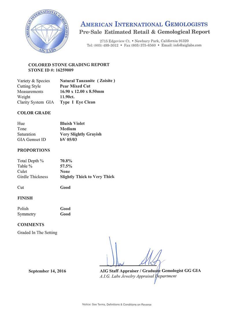 One electronically tested 14KT white gold ladies cast tanzanite and diamond ring with a bright polish finish. The featured tanzanite is set within a tiered diamond floret supported by a ribbed under gallery, completed by a two millimeter wide band. Identified with markings of 'K14'. Condition is new, good workmanship. Containing: One prong set pear mixed cut natural tanzanite, measuring 16.90 x 12.00 x 8.50mm, 3%. bulge factor, approximate weight of 11.90ct., clarity is eye clean, type I, medium, very slightly grayish, bluish violet color, (GIA bV 5/3), cut is good. Transmitting light with no distortion, transparent. Colored Stone Grading Report attached. Graded in the setting. Tanzanite is a very rare gemstone that is only found in the country of Tanzania. Originally discovered in 1967. Tiffany & Company, named the stone Tanzanite. It is found in the Usumburu Mountains that border the Umba Valley of northern Tanzania. Tanzanite occurs in gray, brown, violet, blue, reddish-purple, & green. The gem is interesting because of its exceptional pleochroism. Rotated in different directions a tanzanite will exhibit multiple changes of color. Tanzanite has a low tolerance to ultrasonic cleaning, and should not be cleaned using this method. Twenty-Seven prong set round brilliant cut diamonds, measuring 2.10 - 2.00 x 1.23mm (depth est.) approximate total weight of 27 Stones = 0.90ct. Graded in the setting. Clarity SI-2 to I-2. Color: F - H Twenty-Six prong set round brilliant cut diamonds, measuring 1.90 - 1.90 x 1.14mm (depth est.) approximate total weight of 26 Stones = 0.70ct. Graded in the setting. Clarity SI-1 to I-1. Color: F - H. Total Weight of Colored Stones 11.90ct.. Total Weight of Diamonds 1.60ct.. Total Weight of Ring 11.06gm. AIG Appraised at $30,360.00.