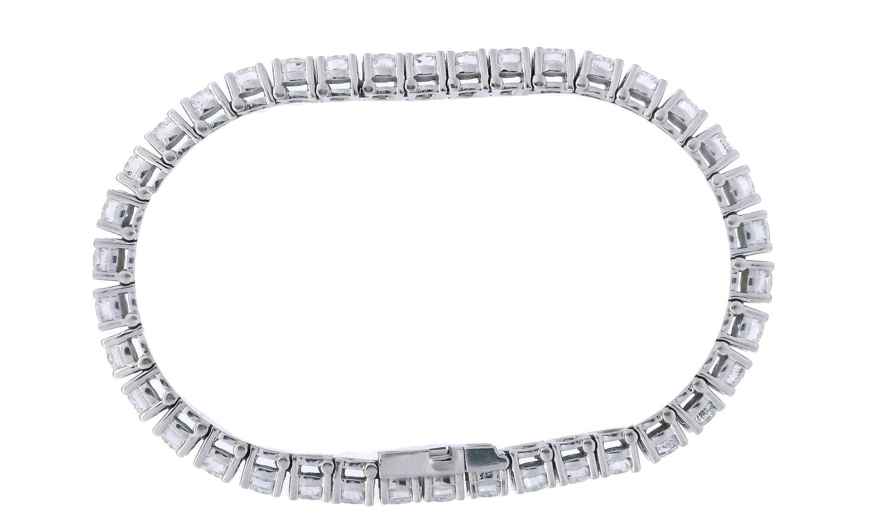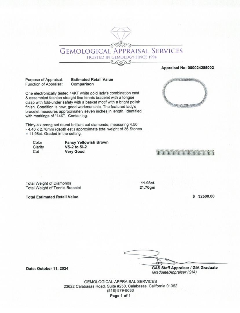 Stand out with this unique 14KT white gold tennis bracelet, featuring a captivating yellow-brown hue in its diamonds. This 7-inch bracelet showcases 36 prong-set round brilliant cut diamonds totaling 11.98 carats, graded from VS-2 to SI-2 in clarity. With its polished setting and distinctive color, it's an ideal choice for anyone looking to add a rare and luxurious piece to their collection.