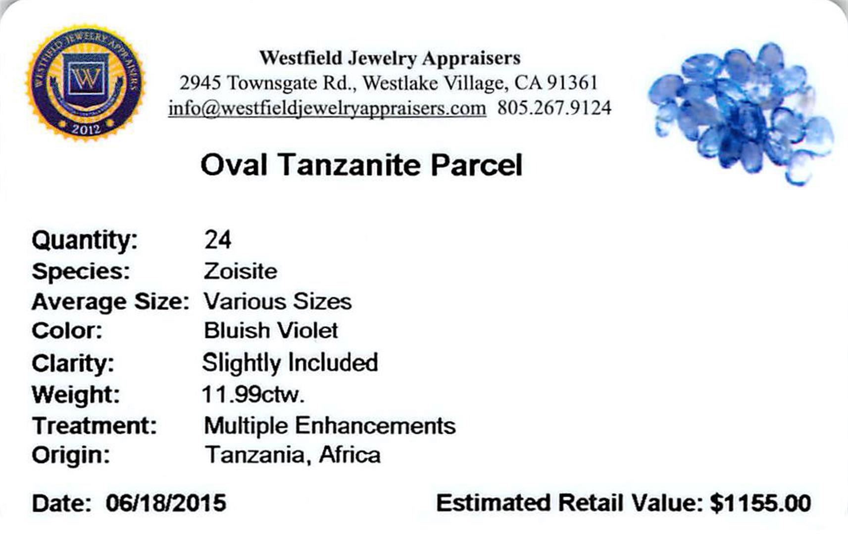 Twenty-four oval mixed cut natural tanzanites exact total weight 11.99ct., clarity is slightly included, type I, medium dark, very slightly grayish, bluish violet color, (GIA bV 6/3), cut is good. Transmitting light with a minimum of distortion, transparent. Naturally occurring internal & external characteristics are present. Color grade is an average for the group. Tanzanite is a very rare gemstone that is only found in the country of Tanzania. Originally discovered in 1967. Tiffany & Company, named the stone Tanzanite. It is found in the Usumburu Mountains that border the Umba Valley of northern Tanzania. Tanzanite occurs in gray, brown, violet, blue, reddish-purple, & green. The gem is interesting because of its exceptional pleochroism. Rotated in different directions a tanzanite will exhibit multiple changes of color. Tanzanite has a low tolerance to ultrasonic cleaning, and should not be cleaned using this method. Westfield Appraised at $1,155.00.