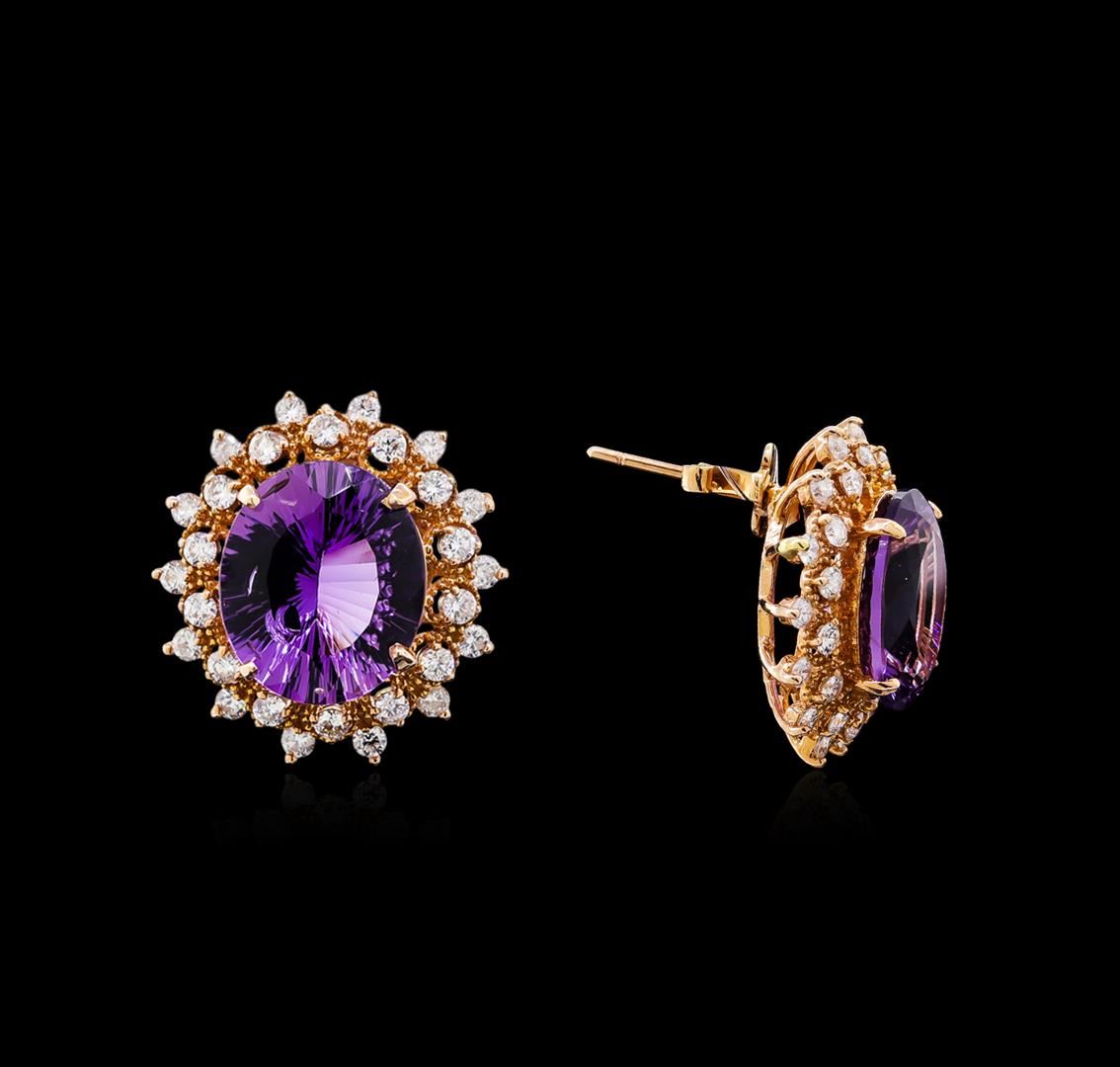 One 14KT rose gold 12.00ctw amethyst and diamond earrings. Metal: 14KT solid rose gold. Face Measurements: 19 x 21mm. Finish: Bright polish. Total Item Weight: 9.0 grams. Markings: Stamped 14K. Country Made: USA. Containing: 2 oval Amethyst with a total weight of 12.00ct. Measuring: 11 x 13mm. Color: Purple. Treatment: None. Setting: Prong. Saturation: Moderately strong. Tone: Light. Clarity: Type 2. Cut: Excellent. The amethysts are complemented by 56 round Diamonds with a total weight of 1.70ct. Measuring: 1.5mm. Treatment: None. Setting: Prong. Color Grade: G - H. Clarity: SI1 - SI2. Cut: Very good. Excellent workmanship. Gemstones graded in the setting. BHGL Appraised at $11,580.00.