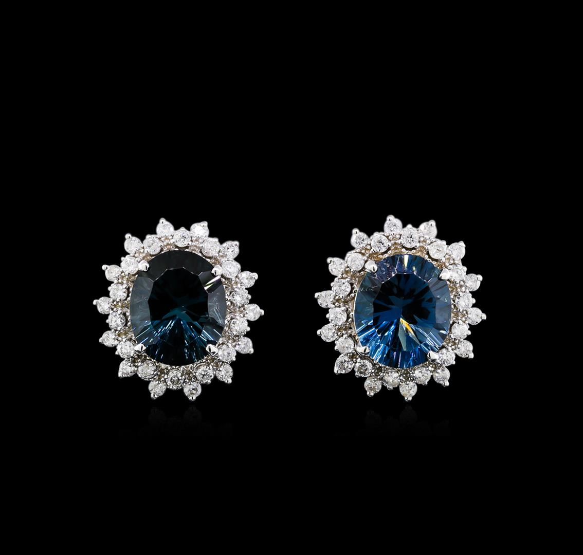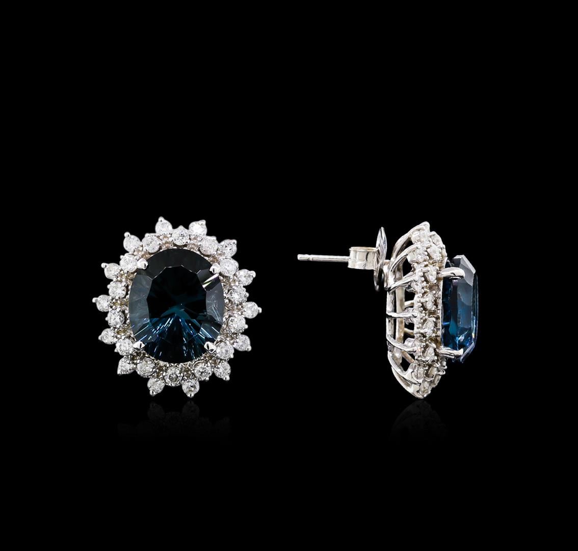 One 14KT white gold 12.00ctw topaz and diamond earrings. Metal: 14KT solid white gold. Face Measurements: 18 x 19mm. Finish: Bright polish. Total Item Weight: 8.0 grams. Markings: Stamped 14K. Country Made: USA. Containing: 2 oval Topaz with a total weight of 12.00ct. Measuring: 10 x 12mm. Color: Blue. Treatment: None. Setting: Prong. Saturation: Moderately strong. Tone: Dark. Clarity: Type 2. Cut: Very good. The topaz are complemented by 56 round Diamonds with a total weight of 1.40ct. Measuring: 1.4mm. Treatment: None. Setting: Prong. Color Grade: G - H. Clarity: SI1 - SI2. Cut: Very good. Excellent workmanship. Gemstones graded in the setting. BHGL Appraised at $9,700.00.