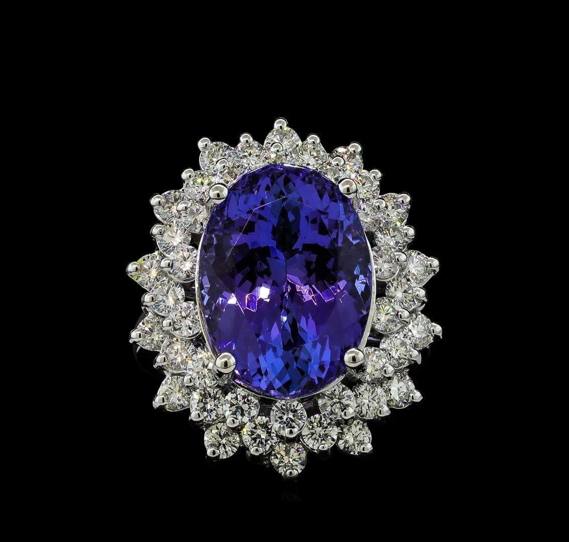 One electronically tested 14KT white gold lady's cast fashion ring with a triple basket halo with a bright polish finish. The featured lady's ring has a shank measuring 2.40 millimeters wide. Identified with markings of 'K14'. Condition is new, good workmanship. Containing: One prong set oval modified brilliant cut natural tanzanite, measuring 16.01 x 11.60 x 8.98mm, (depth est.) 3%. bulge factor, approximate weight of 12.04ct., clarity is eye clean, medium, moderately strong, violetish blue color, (GIA vB 5/4), cut is very good. Transmitting light with no distortion, transparent. Colored gemstones are presumed to have been subjected to commonly used enhancement processes. Graded in the setting. Forty-Two prong set round brilliant cut diamonds, measuring 2.40 - 2.30 x 1.46mm (depth est.) approximate total weight of 42 Stones = 2.12ct. Graded in the setting. Clarity VS-2 to SI-2. Color: H - I Cut Good. Total Weight of Colored Stones 12.04ct.. Total Weight of Diamonds 2.12ct.. Total Weight of Ring 10.60gm. GAS Appraised.