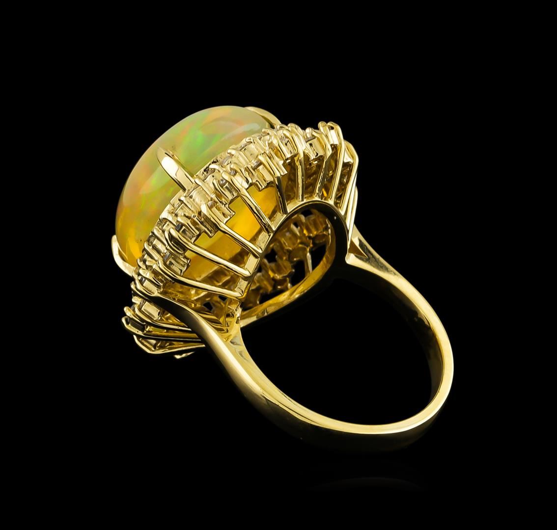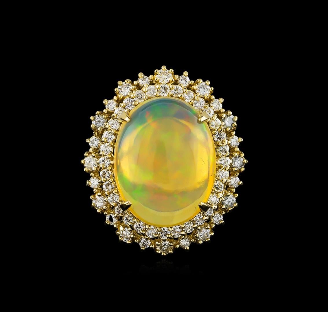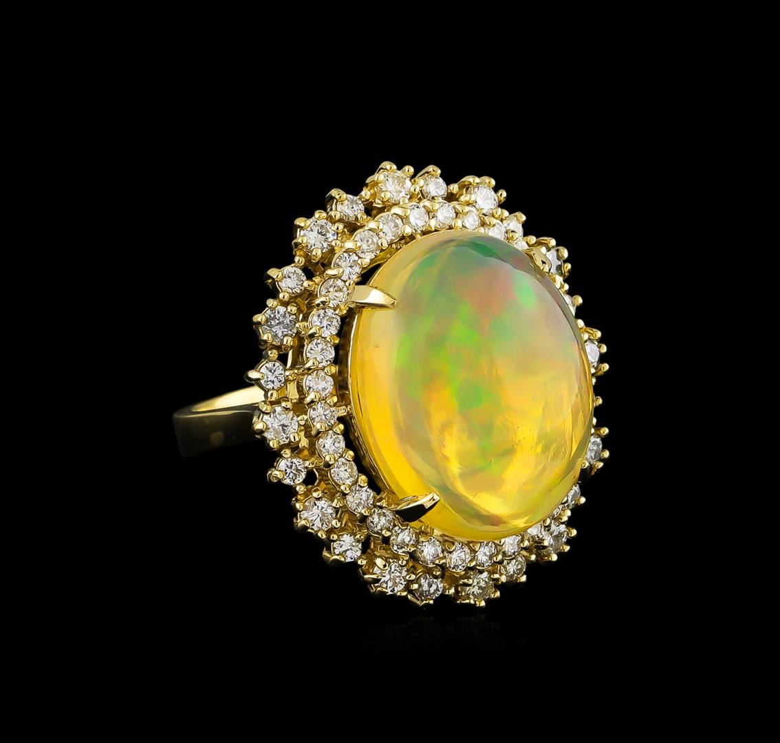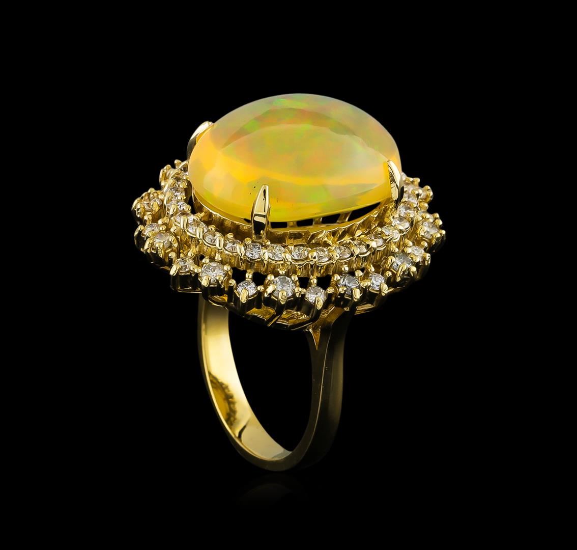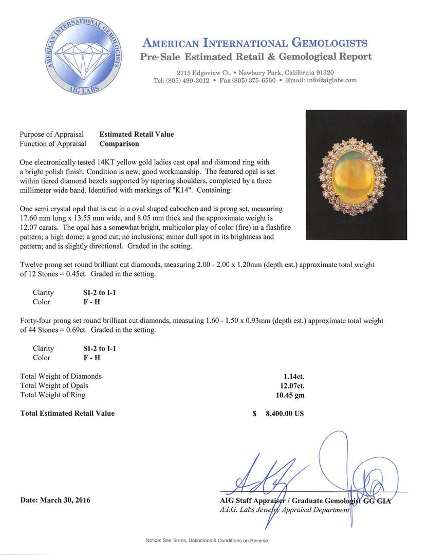 One electronically tested 14KT yellow gold ladies cast opal and diamond ring with a bright polish finish. The featured opal is set within tiered diamond bezels supported by tapering shoulders, completed by a three millimeter wide band. Identified with markings of "K14". Condition is new, good workmanship. Containing: One semi crystal opal that is cut in a oval shaped cabochon and is prong set, measuring 17.60 mm long x 13.55 mm wide, and 8.05 mm thick and the approximate weight is 12.07 carats. The opal has a somewhat bright, multicolor play of color (fire) in a flashfire pattern; a high dome; a good cut; no inclusions; minor dull spot in its brightness and pattern; and is slightly directional. Graded in the setting. Twelve prong set round brilliant cut diamonds, measuring 2.00 - 2.00 x 1.20mm (depth est.) approximate. Total Weight of 12 Stones = 0.45ct. Graded in the setting. Clarity: SI-2 to I-1. Color: F - H Forty-Four prong set round brilliant cut diamonds, measuring 1.60 - 1.50 x 0.93mm (depth est.) approximate. Total Weight of 44 Stones = 0.69ct. Graded in the setting. Clarity: SI-2 to I-1. Color: F - H. Total Weight of Diamonds 1.14ct. Total Weight of Opals 12.07ct. Total Weight of Ring 10.45gm. AIG Appraised at $8,400.00.