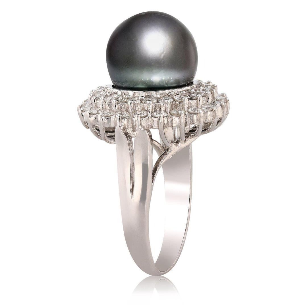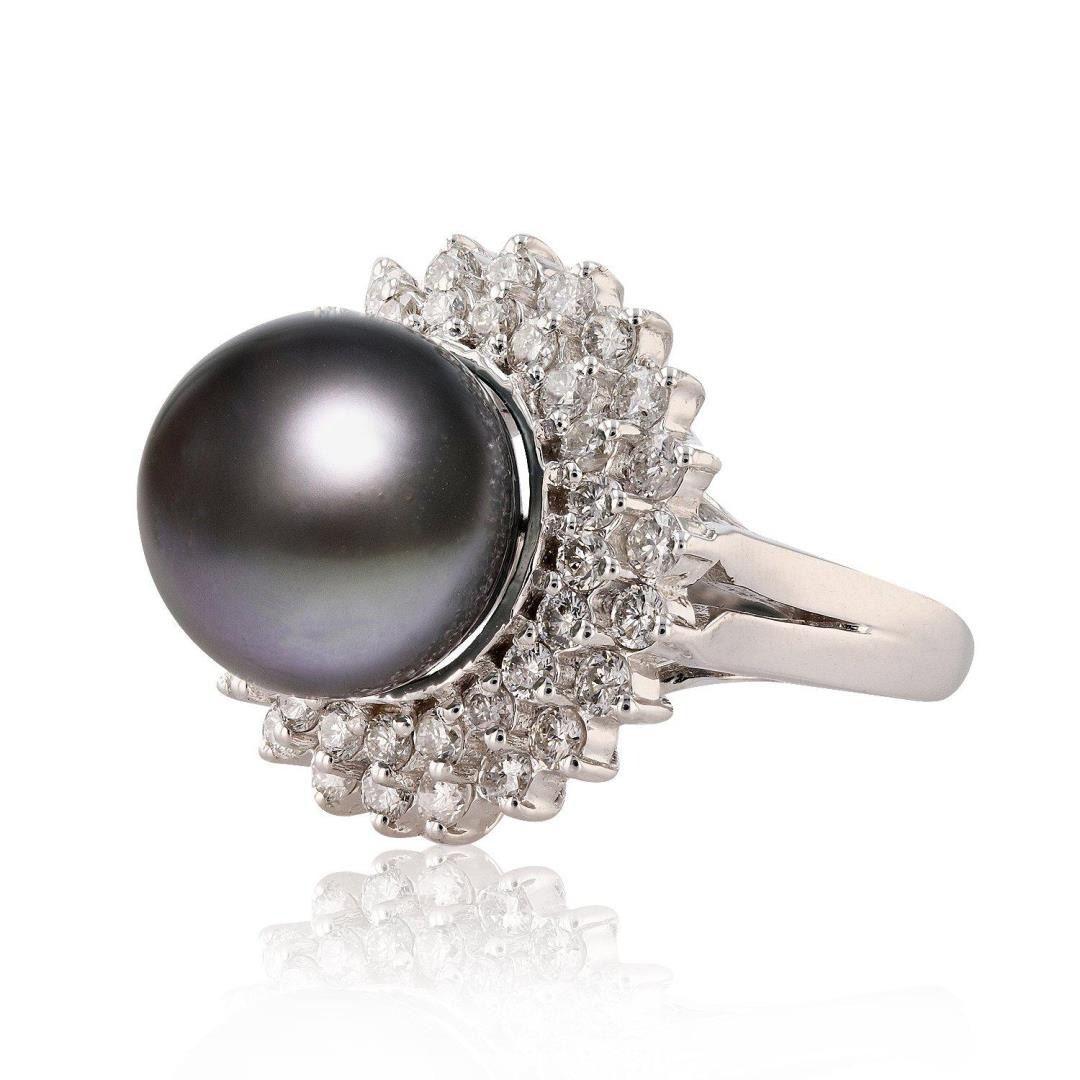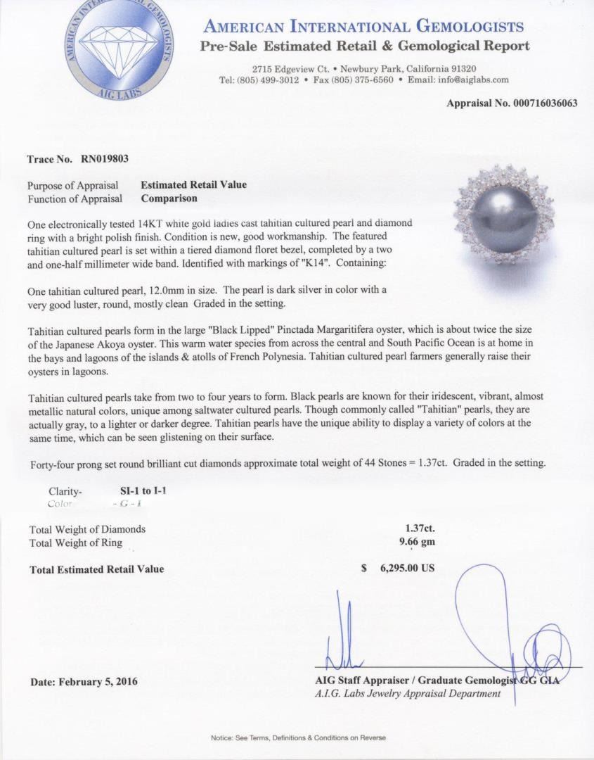 One electronically tested 14KT white gold ladies cast tahitian cultured pearl and diamond ring with a bright polish finish. Condition is new, good workmanship. The featured tahitian cultured pearl is set within a tiered diamond floret bezel, completed by a two and one-half millimeter wide band. Identified with markings of "K14". Containing: One tahitian cultured pearl, 12.0mm in size. The pearl is dark silver in color with a very good luster, round, mostly clean Graded in the setting. Tahitian cultured pearls form in the large "Black Lipped" Pinctada Margaritifera oyster, which is about twice the size of the Japanese Akoya oyster. This warm water species from across the central and South Pacific Ocean is at home in the bays and lagoons of the islands and atolls of French Polynesia. Tahitian cultured pearl farmers generally raise their oysters in lagoons. Tahitian cultured pearls take from two to four years to form. Black pearls are known for their iridescent, vibrant, almost metallic natural colors, unique among saltwater cultured pearls. Though commonly called "Tahitian" pearls, they are actually gray, to a lighter or darker degree. Tahitian pearls have the unique ability to display a variety of colors at the same time, which can be seen glistening on their surface. Forty-four prong set round brilliant cut diamonds approximate total weight of 44 Stones = 1.37ct. Graded in the setting. Clarity SI-1 to I-1 Color G-I Total Weight of Diamonds 1.37ct. Total Weight of Ring 9.66 gm #Size: 7