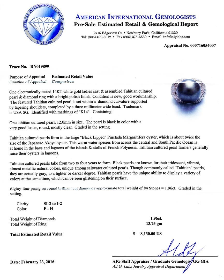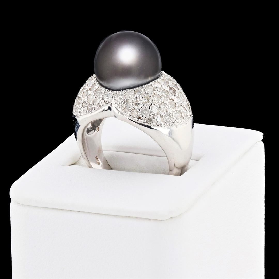 12.0mm Tahitian Cultured Pearl with 1.96ctw Diamond 14K White Gold Ring. Please see Photos and Description for all available information. This ring is made with a 12.0mm Tahitian Cultured Pearl and 1.96ctw of side stone diamonds. The Tahitian Cultured Pearl is known for its unique black lip color and is one of the largest cultured pearls in the world. This ring is available in a size 6 1/4.