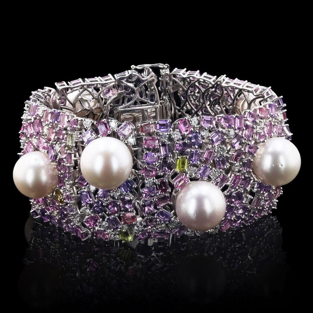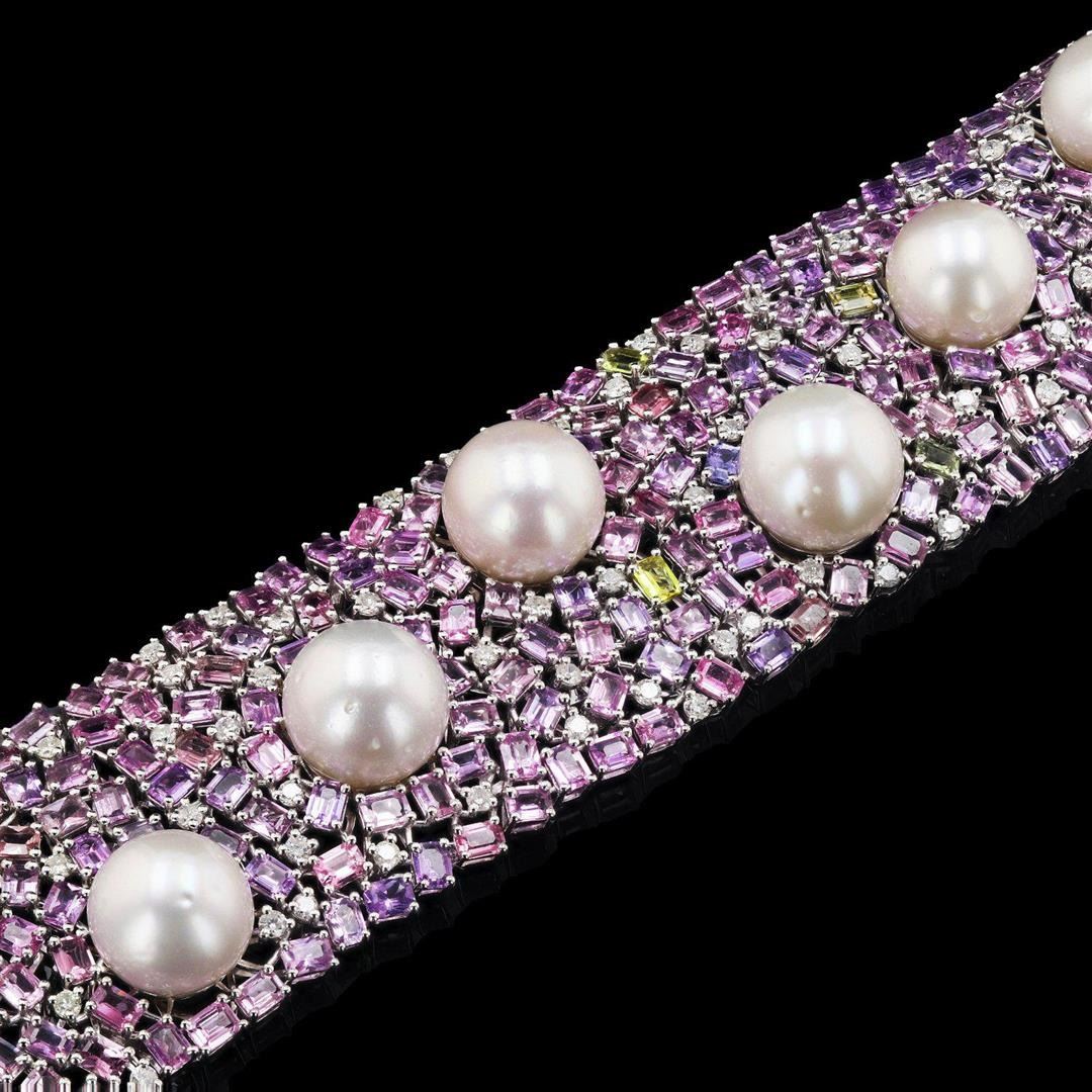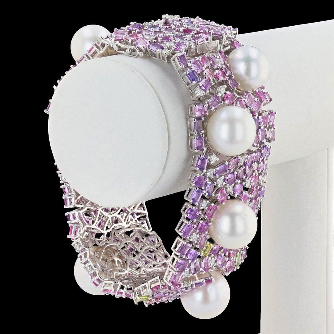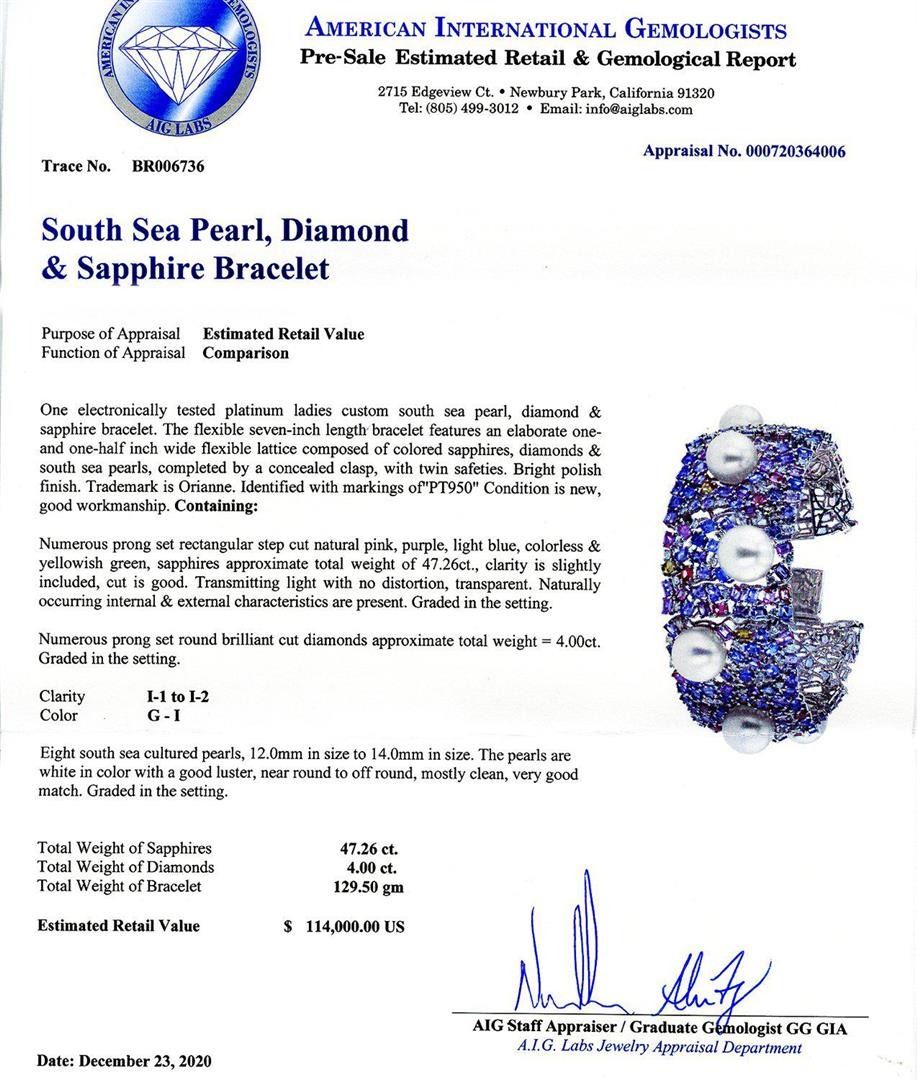 One electronically tested platinum ladies custom south sea pearl, diamond and sapphire bracelet. The flexible seven-inch length bracelet features an elaborate one-and one-half inch wide flexible lattice composed of colored sapphires, diamonds and south se