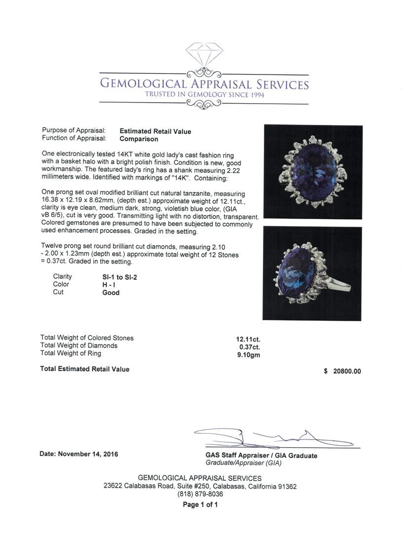 One electronically tested 14KT white gold lady's cast fashion ring with a basket halo with a bright polish finish. The featured lady's ring has a shank measuring 2.22 millimeters wide. Identified with markings of '14K'. Condition is new, good workmanship. Containing: One prong set oval modified brilliant cut natural tanzanite, measuring 16.38 x 12.19 x 8.62mm, (depth est.) approximate weight of 12.11ct., clarity is eye clean, medium dark, strong, violetish blue color, (GIA vB 6/5), cut is very good. Transmitting light with no distortion, transparent. Colored gemstones are presumed to have been subjected to commonly used enhancement processes. Graded in the setting. Twelve prong set round brilliant cut diamonds, measuring 2.10 - 2.00 x 1.23mm (depth est.) approximate total weight of 12 Stones = 0.37ct. Graded in the setting. Clarity SI-1 to SI-2. Color: H - I Cut Good. Total Weight of Colored Stones 12.11ct.. Total Weight of Diamonds 0.37ct.. Total Weight of Ring 9.10gm GAS Appraised at $20,800.00.