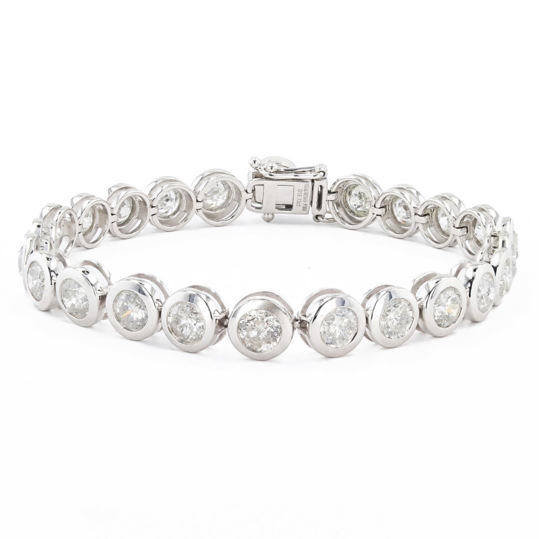 Platinum (PLAT) round brilliant cut diamond bracelet. Round brilliant cut diamonds are mounted throughout the center of the bracelet. The bracelet has a gross weight of 30.1 Grams. Trademark is "Oscar Friedman". #NATURAL DIAMOND# SHAPE: Round Brilliant Cut WEIGHT: 12.13 carat total (24pcs.) DIMENSIONS: 5.4 x 5.0mm GIRDLE: Thin-Thick, Faceted CUTLET: None CLARITY: I1-I2 COLOR: G-H CUT: Excellent SYMMETRY: Excellent POLISH: Excellent FLUORESCENCE: None #METAL# METAL: Platinum PURITY: 950 COLOR: White CONDITION: Excellent FINISH: High Polish #LREF-17911
