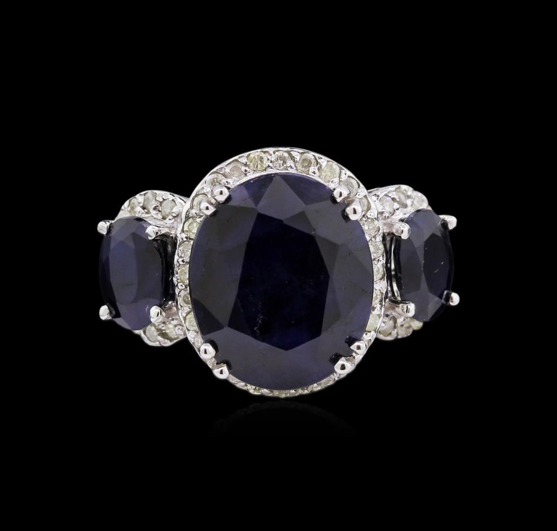 One 14KT white gold sapphire and diamond ring. Three oval cut sapphire corundum gemstones are prong mounted in the center of the ring. Round brilliant cut diamonds accent the ring around the center gemstones and on both sides. The ring is cast stamped "14K" and has a gross weight of 9.6 Grams. Diamond(s): Shape: Round Brilliant Cut. Weight: 0.85 carat. Average Clarity: I1. Average Color: H-K. Symmetry: Very Good. Polish: Very Good. GemStone(s): Sapphire Corundum. Nature: Natural. Shape: Oval, Faceted. Quantity: 3, Mounted. Weight: 12.15 carat. Dimensions: Length - 14.10-7.50 mm. ; Width - 11.92-5.20 mm. Bulge: Visible. Clarity: SI, Type 3. Color: Blue (5/5). Symmetry: Very Good. Color Intensity: Medium. Transparency: Translucent. Tone: Dark. Enhancements: Indications of high temperature heat treatment, with glass and flux additives. Metal(s): Metal: Gold, Stamped. Purity: 14K. Color: White. Condition: Excellent. Finish: High polish. GGA Appraised at $10,325.00.
