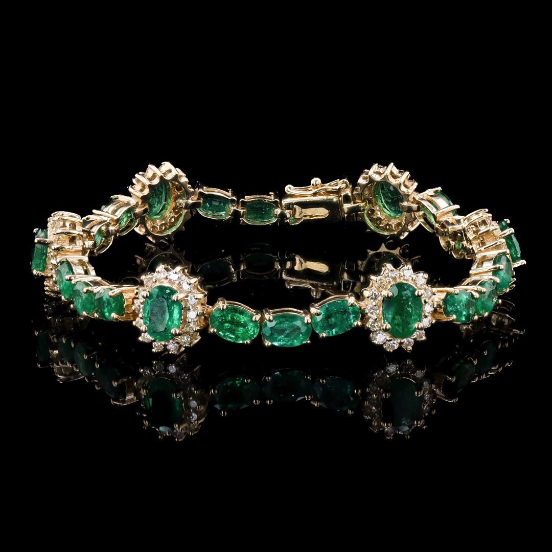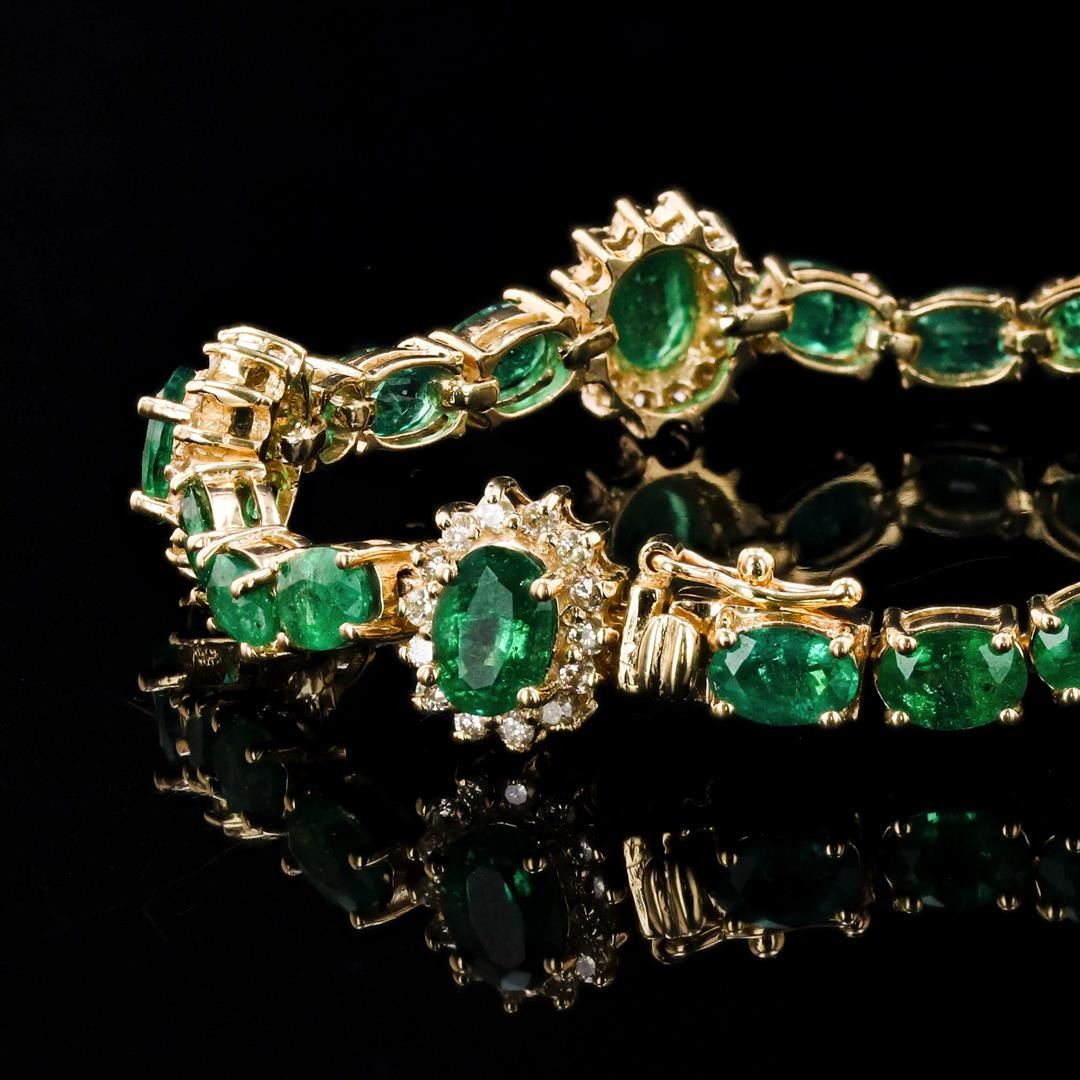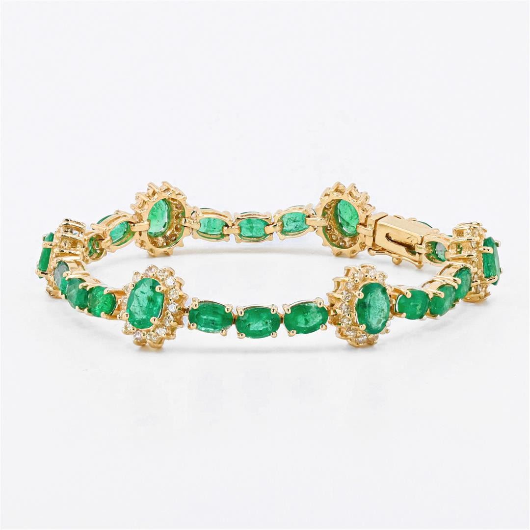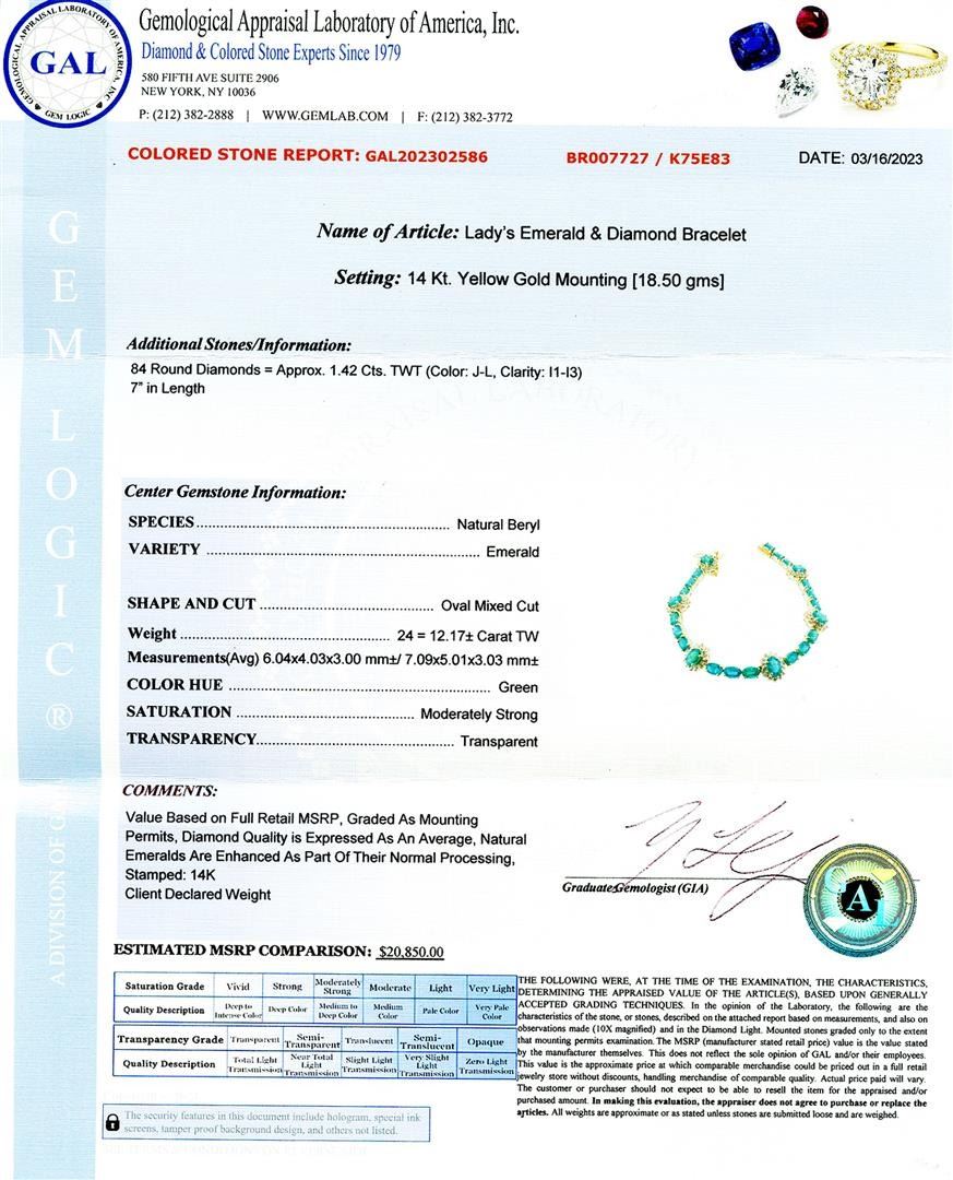 12.17ctw Emerald and 1.42ctw Diamond 14K Yellow Gold Bracelet. Lady's Emerald and Diamond Bracelet Setting: 14 Kt. Yellow Gold Mounting [18.50 gms] Additional Stones/Information: 84 Round Diamonds = Approx. 1.42 Cts. TWT (Color: J-L, Clarity: I1-I3) 7" in Length Center Gemstone Information: SPECIES: Natural Beryl VARIETY: Emerald SHAPE AND CUT: Oval Mixed Cut Weight 24 = 12.17+/- Carat TW Measurements(Avg): 6.04x4.03x3.00 7.09x5.01x3.03 mm+/- COLOR HUE: Green SATURATION: Moderately Strong TRANSPARENCY: Transparent