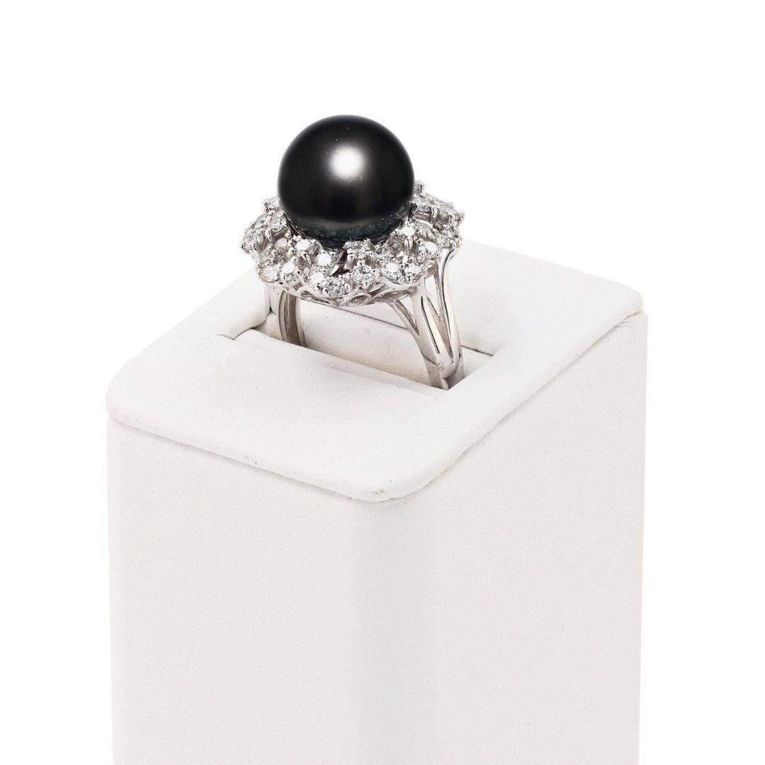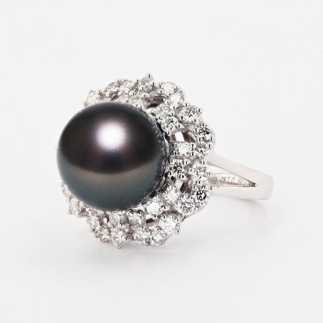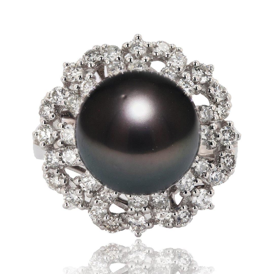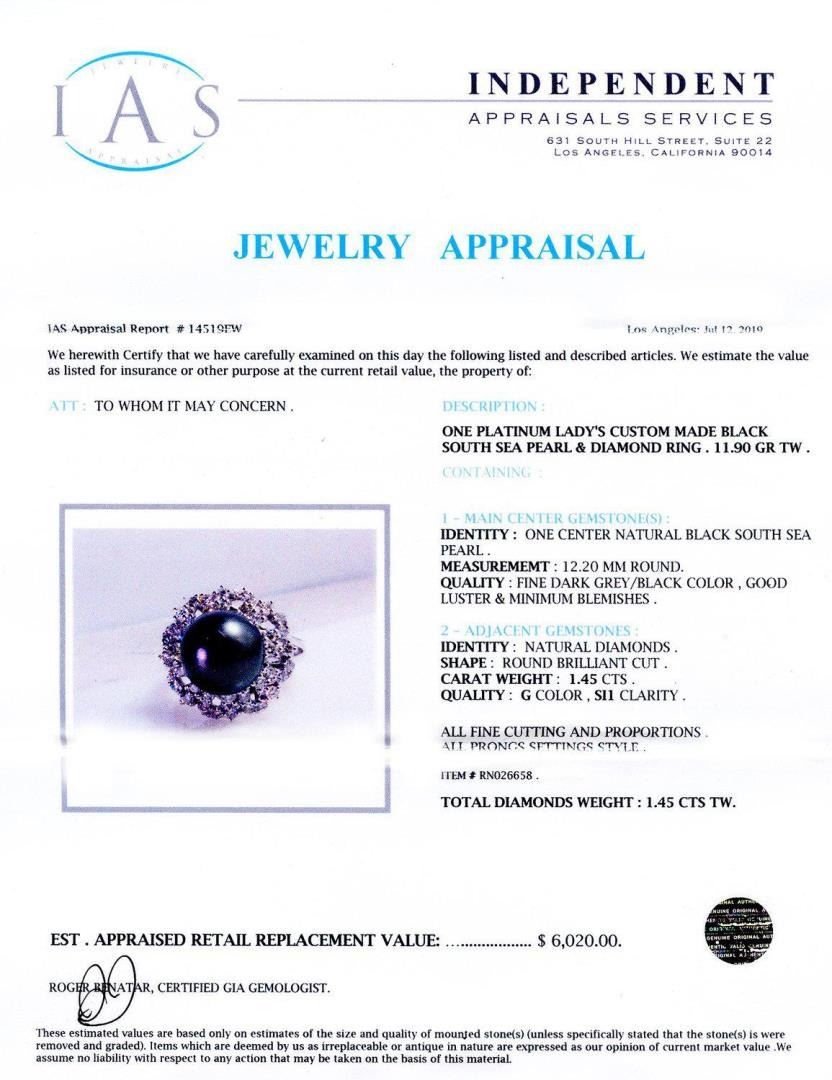 ONE PLATINUM LADY'S CUSTOM MADE BLACK SOUTH SEA PEARL AND DIAMOND RING. 11.90 GR TW. IDENTITY: ONE CENTER NATURAL BLACK SOUTH SEA PEARL. MEASUREMEMT: 12.20MM ROUND. QUALITY: FINE DARK GREY/BLACK COLOR, GOOD LUSTER AND MINIMUM BLEMISHES. IDENTITY: NATURAL DIAMONDS. SHAPE: ROUND BRILLIANT CUT. CARAT WEIGHT: 1.45 CTS. QUALITY: G COLOR, SI1 CLARITY. ALL FINE CUTTING AND PROPORTIONS. ALL PRONGS SETTINGS STYLE. TOTAL DIAMONDS WEIGHT : 1.45 CTS TW. #Size: 7