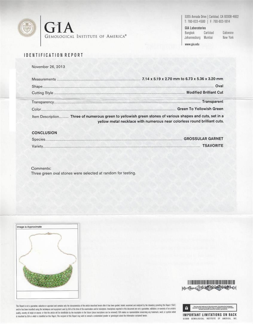 One electronically tested 14KT yellow and white gold lady's combination cast & assembled fashion chest plate necklace with a tongue clasp with foldover safety with a bright polish finish. The featured lady's necklace has a crescent shaped motif and a bar link chain that measures approximately seventeen inches long and 2.50 millimeters wide. Identified with markings of '14K'. Condition is new, good workmanship. Containing: Nine prong set triangle modified brilliant cut natural tsavorite garnets, measuring 7.60 x 6.20 x 4.03mm, (depth est.) approximate total weight of 11.07ct., clarity is slightly included, medium, moderately strong, slightly yellowish green color, (GIA slyG 5/4), cut is good. Transmitting light with a minimum of distortion, transparent. Colored gemstones are presumed to have been subjected to commonly used enhancement processes. Graded in the setting. Sixty-three prong set oval modified brilliant cut natural tsavorite garnets, measuring 7.20 x 5.30 x 3.45mm, (depth est.) approximate total weight of 63.00 ct., clarity is slightly included, medium, moderately strong, slightly yellowish green color, (GIA slyG 5/4), cut is good. Transmitting light with a minimum of distortion, transparent. Colored gemstones are presumed to have been subjected to commonly used enhancement processes. Three stones were selected and graded in the GIA Laboratory, Report #6157767366. Nine prong set emerald standard step cut natural tsavorite garnets, measuring 6.75 x 4.20 x 2.73mm, (depth est.) approximate total weight of 6.75ct., clarity is slightly included, medium, moderately strong, slightly yellowish green color, (GIA slyG 5/4), cut is good. Transmitting light with a minimum of distortion, transparent. Colored gemstones are presumed to have been subjected to commonly used enhancement processes. Graded in the setting. Two prong set marquise modified brilliant cut natural tsavorite garnets, measuring 8.20 x 4.50 x 2.93mm, (depth est.) approximate total weight of 1.50 ct., clarity is slightly included, medium, moderately strong, slightly yellowish green color, (GIA slyG 5/4), cut is good. Transmitting light with a minimum of distortion, transparent. Colored gemstones are presumed to have been subjected to commonly used enhancement processes. Graded in the setting. One prong set rectangular cushion modified brilliant cut natural tsavorite garnet, measuring 8.50 x 5.08 x 2.78mm, (depth est.) approximate weight of 1.02ct., clarity is slightly included, medium, moderately strong, slightly yellowish green color, (GIA slyG 5/4), cut is good. Transmitting light with a minimum of distortion, transparent. Colored gemstones are presumed to have been subjected to commonly used enhancement processes. Graded in the setting. One prong set round modified brilliant cut natural tsavorite garnet, measuring 6.50 - 6.40 x 4.20 mm, (depth est.) approximate weight of 1.20 ct., clarity is slightly included, medium, moderately strong, slightly yellowish green color, (GIA slyG 5/4), cut is good. Transmitting light with a minimum of distortion, transparent. Colored gemstones are presumed to have been subjected to commonly used enhancement processes. Graded in the setting. One Hundred Twenty-Seven prong set round brilliant cut diamonds, measuring 2.10 - 1.80 x 1.21mm (depth est.) approximate total weight of 127 Stones = 4.05ct. Graded in the setting. Color I - J Clarity SI-2 to I-1 Cut Good. Total Weight of Colored Stones 84.54ct.. Total Weight of Diamonds 4.05ct.. Total Weight of Chest Plate Necklace 72.20gm GAS Appraised.