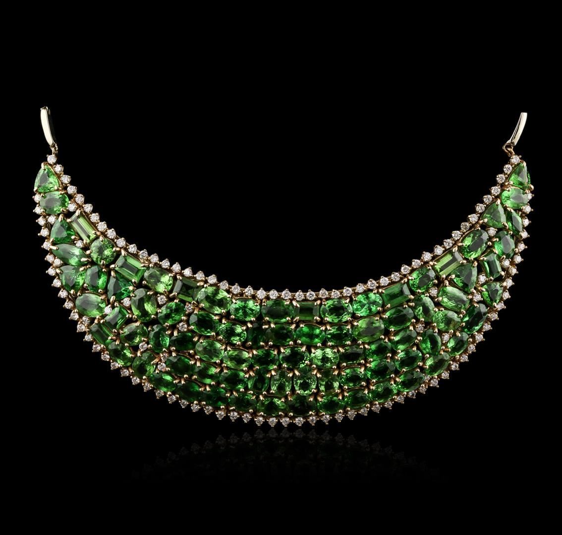 One electronically tested 14KT yellow and white gold lady's combination cast & assembled fashion chest plate necklace with a tongue clasp with foldover safety with a bright polish finish. The featured lady's necklace has a crescent shaped motif and a bar link chain that measures approximately seventeen inches long and 2.50 millimeters wide. Identified with markings of '14K'. Condition is new, good workmanship. Containing: Nine prong set triangle modified brilliant cut natural tsavorite garnets, measuring 7.60 x 6.20 x 4.03mm, (depth est.) approximate total weight of 11.07ct., clarity is slightly included, medium, moderately strong, slightly yellowish green color, (GIA slyG 5/4), cut is good. Transmitting light with a minimum of distortion, transparent. Colored gemstones are presumed to have been subjected to commonly used enhancement processes. Graded in the setting. Sixty-three prong set oval modified brilliant cut natural tsavorite garnets, measuring 7.20 x 5.30 x 3.45mm, (depth est.) approximate total weight of 63.00 ct., clarity is slightly included, medium, moderately strong, slightly yellowish green color, (GIA slyG 5/4), cut is good. Transmitting light with a minimum of distortion, transparent. Colored gemstones are presumed to have been subjected to commonly used enhancement processes. Three stones were selected and graded in the GIA Laboratory, Report #6157767366. Nine prong set emerald standard step cut natural tsavorite garnets, measuring 6.75 x 4.20 x 2.73mm, (depth est.) approximate total weight of 6.75ct., clarity is slightly included, medium, moderately strong, slightly yellowish green color, (GIA slyG 5/4), cut is good. Transmitting light with a minimum of distortion, transparent. Colored gemstones are presumed to have been subjected to commonly used enhancement processes. Graded in the setting. Two prong set marquise modified brilliant cut natural tsavorite garnets, measuring 8.20 x 4.50 x 2.93mm, (depth est.) approximate total weight of 1.50 ct., clarity is slightly included, medium, moderately strong, slightly yellowish green color, (GIA slyG 5/4), cut is good. Transmitting light with a minimum of distortion, transparent. Colored gemstones are presumed to have been subjected to commonly used enhancement processes. Graded in the setting. One prong set rectangular cushion modified brilliant cut natural tsavorite garnet, measuring 8.50 x 5.08 x 2.78mm, (depth est.) approximate weight of 1.02ct., clarity is slightly included, medium, moderately strong, slightly yellowish green color, (GIA slyG 5/4), cut is good. Transmitting light with a minimum of distortion, transparent. Colored gemstones are presumed to have been subjected to commonly used enhancement processes. Graded in the setting. One prong set round modified brilliant cut natural tsavorite garnet, measuring 6.50 - 6.40 x 4.20 mm, (depth est.) approximate weight of 1.20 ct., clarity is slightly included, medium, moderately strong, slightly yellowish green color, (GIA slyG 5/4), cut is good. Transmitting light with a minimum of distortion, transparent. Colored gemstones are presumed to have been subjected to commonly used enhancement processes. Graded in the setting. One Hundred Twenty-Seven prong set round brilliant cut diamonds, measuring 2.10 - 1.80 x 1.21mm (depth est.) approximate total weight of 127 Stones = 4.05ct. Graded in the setting. Color I - J Clarity SI-2 to I-1 Cut Good. Total Weight of Colored Stones 84.54ct.. Total Weight of Diamonds 4.05ct.. Total Weight of Chest Plate Necklace 72.20gm GAS Appraised.