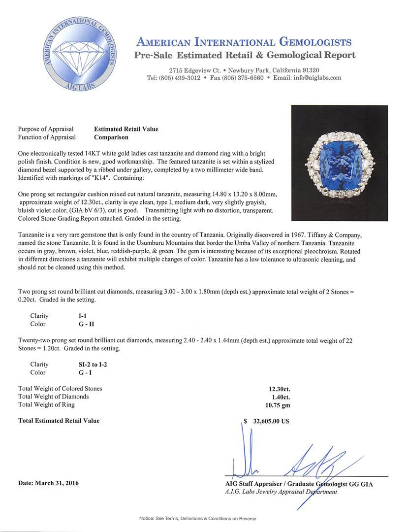 One electronically tested 14KT white gold ladies cast tanzanite and diamond ring with a bright polish finish. The featured tanzanite is set within a stylized diamond bezel supported by a ribbed under gallery, completed by a two millimeter wide band. Identified with markings of "K14". Condition is new, good workmanship. Containing: One prong set rectangular cushion mixed cut natural tanzanite, measuring 14.80 x 13.20 x 8.00mm, approximate weight of 12.30ct., clarity is eye clean, type I, medium dark, very slightly grayish, bluish violet color, (GIA bV 6/3), cut is good. Transmitting light with no distortion, transparent. Colored Stone Grading Report attached. Graded in the setting. Tanzanite is a very rare gemstone that is only found in the country of Tanzania. Originally discovered in 1967. Tiffany & Company, named the stone Tanzanite. It is found in the Usumburu Mountains that border the Umba Valley of northern Tanzania. Tanzanite occurs in gray, brown, violet, blue, reddish-purple, & green. The gem is interesting because of its exceptional pleochroism. Rotated in different directions a tanzanite will exhibit multiple changes of color. Tanzanite has a low tolerance to ultrasonic cleaning, and should not be cleaned using this method. Two prong set round brilliant cut diamonds, measuring 3.00 - 3.00 x 1.80mm (depth est.) approximate total weight of 2 Stones = 0.20ct. Graded in the setting. Clarity: I-1. Color: G - H Twenty-Two prong set round brilliant cut diamonds, measuring 2.40 - 2.40 x 1.44mm (depth est.) approximate total weight of 22 Stones = 1.20ct. Graded in the setting. Clarity: SI-2 to I-2. Color: G - I. Total Weight of Colored Stones 12.30ct. Total Weight of Diamonds 1.40ct. Total Weight of Ring 10.75gm. AIG Appraised at $32,605.00.