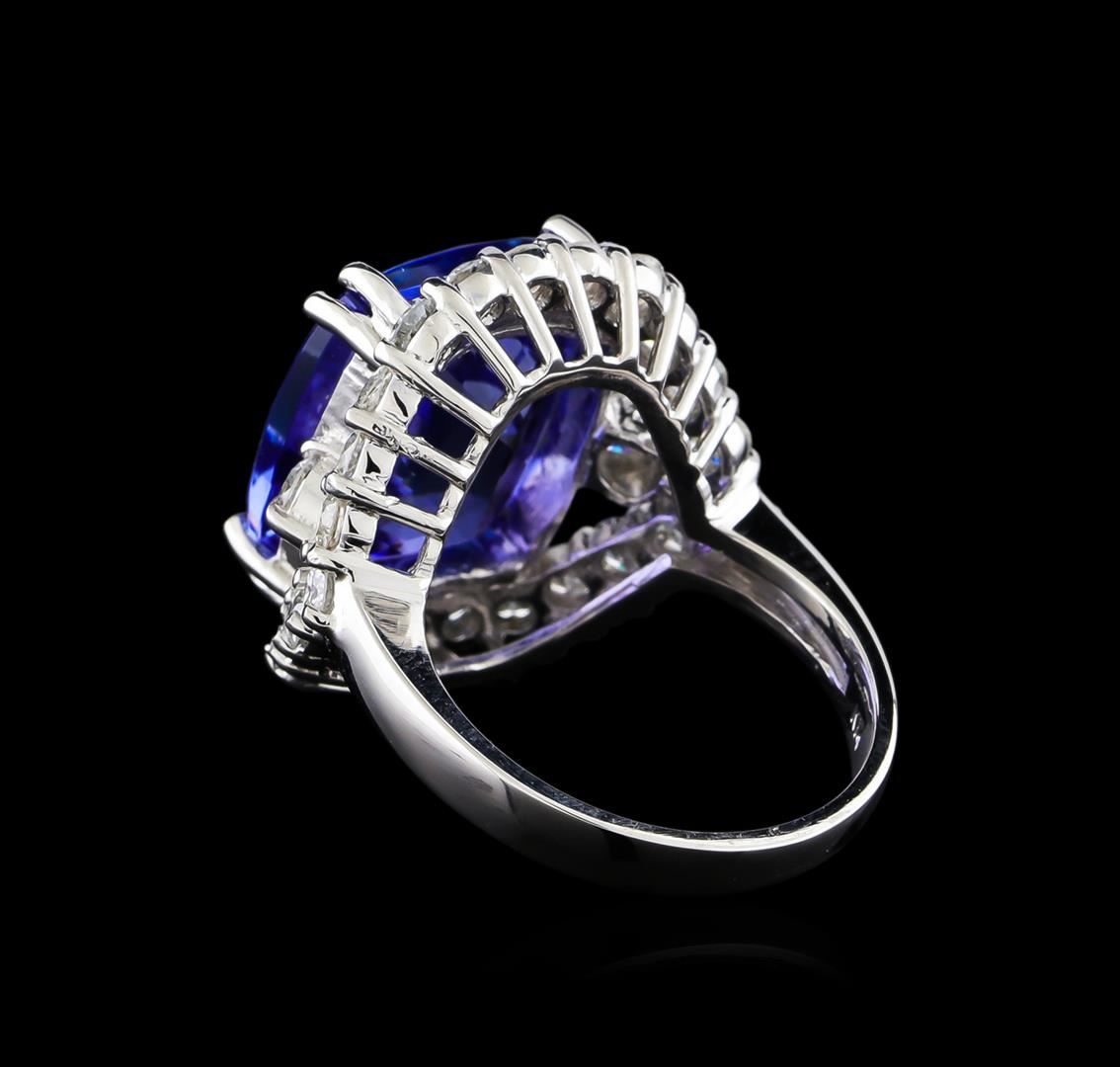 One electronically tested 14KT white gold ladies cast tanzanite and diamond ring with a bright polish finish. The featured tanzanite is set within a stylized diamond bezel supported by a ribbed under gallery, completed by a two millimeter wide band. Identified with markings of "K14". Condition is new, good workmanship. Containing: One prong set rectangular cushion mixed cut natural tanzanite, measuring 14.80 x 13.20 x 8.00mm, approximate weight of 12.30ct., clarity is eye clean, type I, medium dark, very slightly grayish, bluish violet color, (GIA bV 6/3), cut is good. Transmitting light with no distortion, transparent. Colored Stone Grading Report attached. Graded in the setting. Tanzanite is a very rare gemstone that is only found in the country of Tanzania. Originally discovered in 1967. Tiffany & Company, named the stone Tanzanite. It is found in the Usumburu Mountains that border the Umba Valley of northern Tanzania. Tanzanite occurs in gray, brown, violet, blue, reddish-purple, & green. The gem is interesting because of its exceptional pleochroism. Rotated in different directions a tanzanite will exhibit multiple changes of color. Tanzanite has a low tolerance to ultrasonic cleaning, and should not be cleaned using this method. Two prong set round brilliant cut diamonds, measuring 3.00 - 3.00 x 1.80mm (depth est.) approximate total weight of 2 Stones = 0.20ct. Graded in the setting. Clarity: I-1. Color: G - H Twenty-Two prong set round brilliant cut diamonds, measuring 2.40 - 2.40 x 1.44mm (depth est.) approximate total weight of 22 Stones = 1.20ct. Graded in the setting. Clarity: SI-2 to I-2. Color: G - I. Total Weight of Colored Stones 12.30ct. Total Weight of Diamonds 1.40ct. Total Weight of Ring 10.75gm. AIG Appraised at $32,605.00.