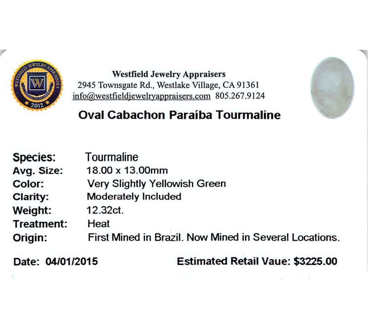 One oval cabochon cut natural Paraiba tourmaline exact weight 12.32ct., clarity is moderately included, cut is good. Westfield Appraised at $3,225.00.