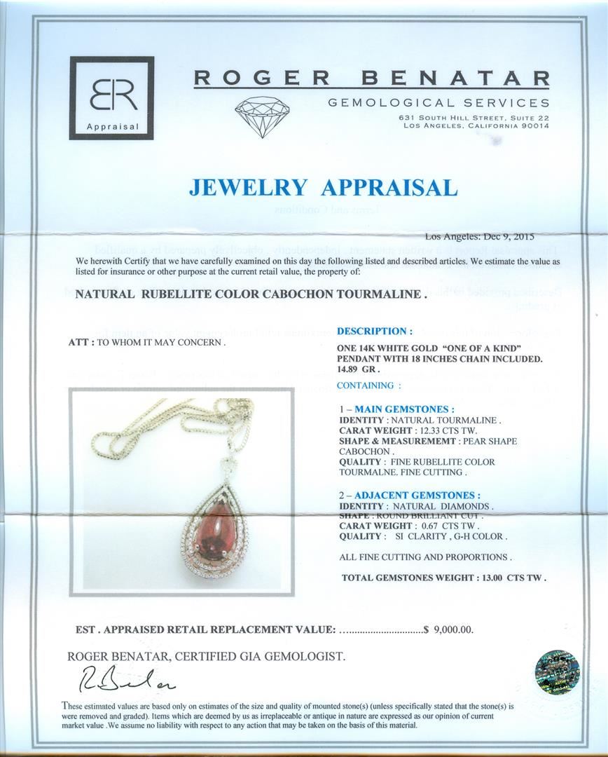 One 14KT White Gold "One of a Kind" Pendant with 18 inches chain included, 14.89 grams. Containing: Main Gemstones: Identity: Natural Tourmaline. Carat Weight: 12.33 cts tw. Shape & Measurement: Pear Shape Cabochon. Quality: Fine Rubellite Color Tourmaline. Fine Cutting. Adjacent Gemstones: Identity: Natural Diamonds. Shape: Round Brilliant Cut. Carat Weight: 0.67 cts tw. Quality: SI Clarity, G-H Color. All fine cutting and proportions. Total Gemstones Weight: 13.00 cts tw. RBGS Appraised at $9,000.00.