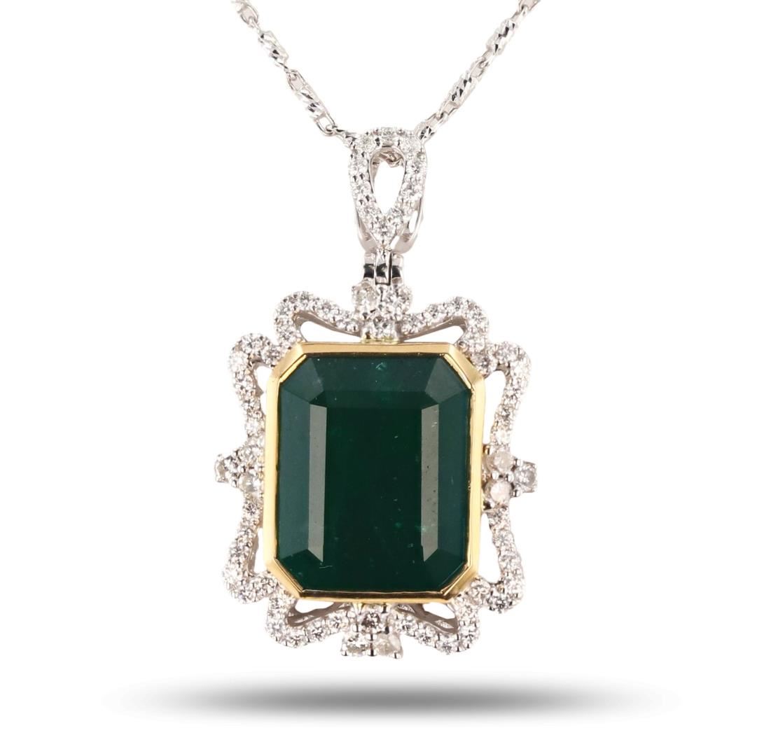 One polished, and tested, 18K yellow and white gold Oscar Friedman designer pendant mounted with: 1 genuine emerald center stone weighing approximately 12.36 carat, and 66 genuine oun diamonds weighing approximately 0.83 carats, The pendant hangs from an 18K white gold link chain measuring 18 inches in length. This tem weighs 1.9 grams, condition is now, excellent workmanship. #MAIN GEMSTONE# Species: Natural Beryl Variety: Emerald Shape: Octagonal Cutting Style: Step Cut Measurements: 14.5 x 11.9mm Weight: 12.36 carat Color: Green Cut Grade: Very Good Refractive Index: 1.564- 1.595 DR Birefringence: 0.005 to 0.009 Hardness: 7.5 - 8 #ADJACENT GEMSTONES ON PENDANT# Identity: Natural Diamond Shape: Round Cutting Style: Brilliant Cut Quantity: 66 Diamonds Measurements: 1.3 - 1.7mm Total Weight: 0.83 carats Color Grade: F - G Clarity Grade: VS1 - VS2 Refractive Index: 2.418 Hardness: 10 EMERALD WEIGHT: 12.36 ct TOTAL DIAMOND WEIGHT: 0.83 cts WEIGHT OF ITEM: 15.9 grams GOLD CONTENT: 18K Yellow and White Gold #LREF-13685