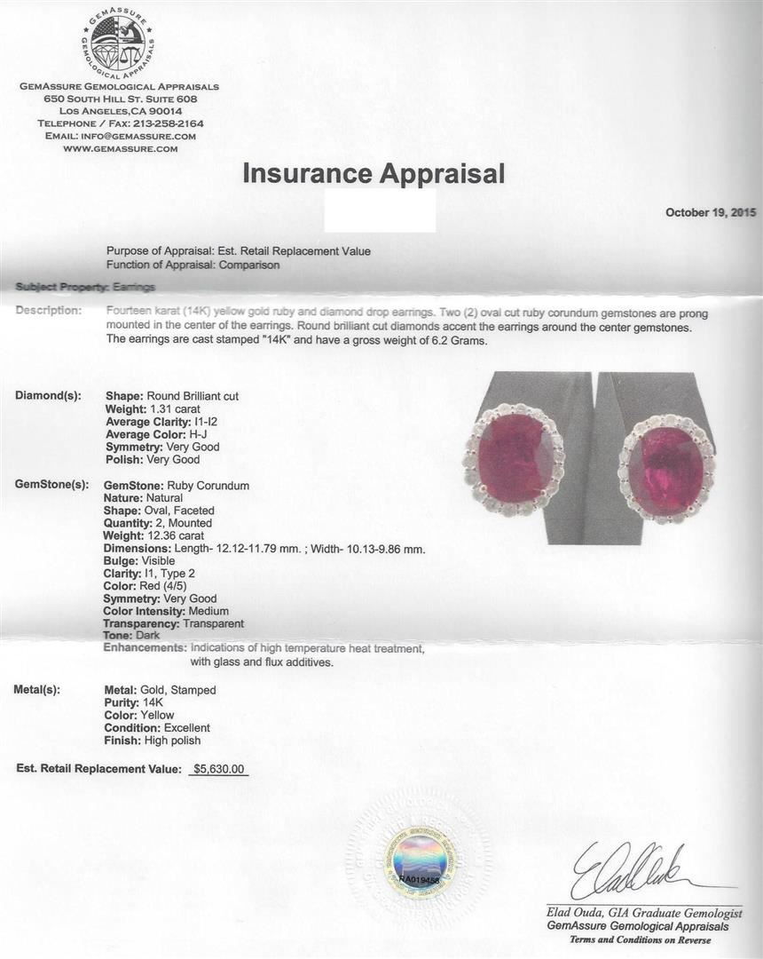 Fourteen karat (14K) yellow gold ruby and diamond drop earrings. Two (2) oval cut ruby corundum gemstones are prong mounted in the center of the earrings. Round brilliant cut diamonds accent the earrings around the center gemstones. The earrings are cast stamped "14K" and has a gross weight of 6.2 Grams. Diamond(s): Shape: Round Brilliant Cut. Weight: 1.31 carat. Average Clarity: I1-I2. Average Color: H-J. Symmetry: Very Good. Polish: Very Good. Gemstone(s): GemStone: Ruby Corundum. Nature: Natural. Shape: Oval, Faceted. Quantity: 2, Mounted. Weight: 12.36 carat. Dimensions: Length-12.12-11.79 mm. ; Width- 10.13-9.86 mm. Bulge: Visible. Clarity: I1, Type 2. Color: Red (4/5). Symmetry: Very Good. Color Intensity: Medium. Transparency: Transparent. Tone: Dark. Enhancements: Indications of high temperature heat treatment, with glass and flux additives. Metal(s): Metal: Gold, Stamped. Purity: 14K. Color: Yellow. Condition: Excellent. Finish: High polish. GGA Appraised.