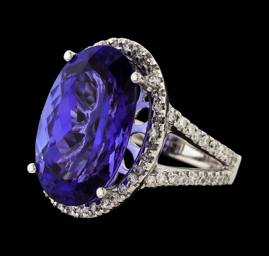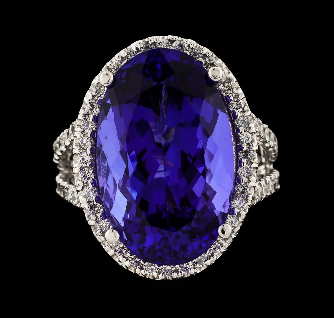 One electronically tested 14KT white gold lady's cast fashion ring with a split cathedral shank with a halo with a bright polish finish. The featured lady's ring has a shank measuring 2.77 millimeters wide. Identified with markings of '14K'. Condition is new, good workmanship. Containing: One prong set oval modified brilliant cut natural tanzanite, measuring 18.28 x 11.44 x 8.25mm, (depth est.) approximate weight of 12.38ct., clarity is eye clean, medium dark, moderately strong, violetish blue color, (GIA vB 6/4), cut is very good. Transmitting light with no distortion, transparent. Colored gemstones are presumed to have been subjected to commonly used enhancement processes. Graded in the setting. Seventy-Six prong set round brilliant cut diamonds, measuring 1.40 - 1.35 x 0.86mm (depth est.) approximate total weight of 76 Stones = 0.75ct. Graded in the setting. Clarity VS-2 to SI-2. Color: H - I Cut Good. Total Weight of Colored Stones 12.38ct.. Total Weight of Diamonds 0.75ct.. Total Weight of Ring 9.40gm. GAS Appraised at $22,565.00.