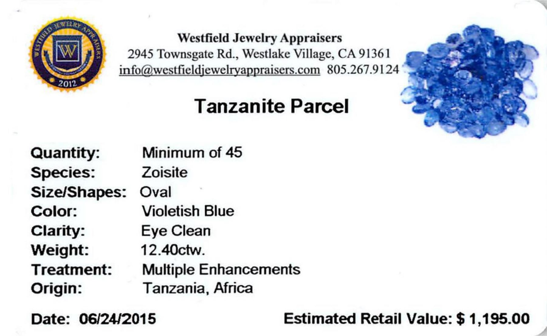 Forty-five oval mixed cut natural tanzanites, measuring 4.00 x 3.00 x 2.00mm, exact total weight 12.40 ct., clarity is slightly included, type I, medium dark, very slightly grayish, violetish blue color, (GIA vB 6/3), cut is good. Measurements & the color grade are an average for the group, Color grade is an average for the group, Transmitting light with no distortion, transparent, Naturally occurring internal & external characteristics are present, Indications of multiple laboratory enhancements, including high temperature heat treatment. Westfield Appraised.