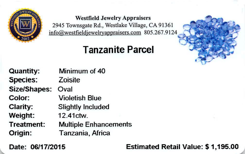 Forty oval mixed cut natural tanzanites exact total weight 12.41ct., clarity is slightly included, type I, medium dark, very slightly grayish, violetish blue color, (GIA vB 6/3), cut is good. Measurements & the color grade are an average for the group, Color grade is an average for the group, Transmitting light with no distortion, transparent, Indications of laboratory high temperature heat treatment. Westfield Appraised at $1,195.00.