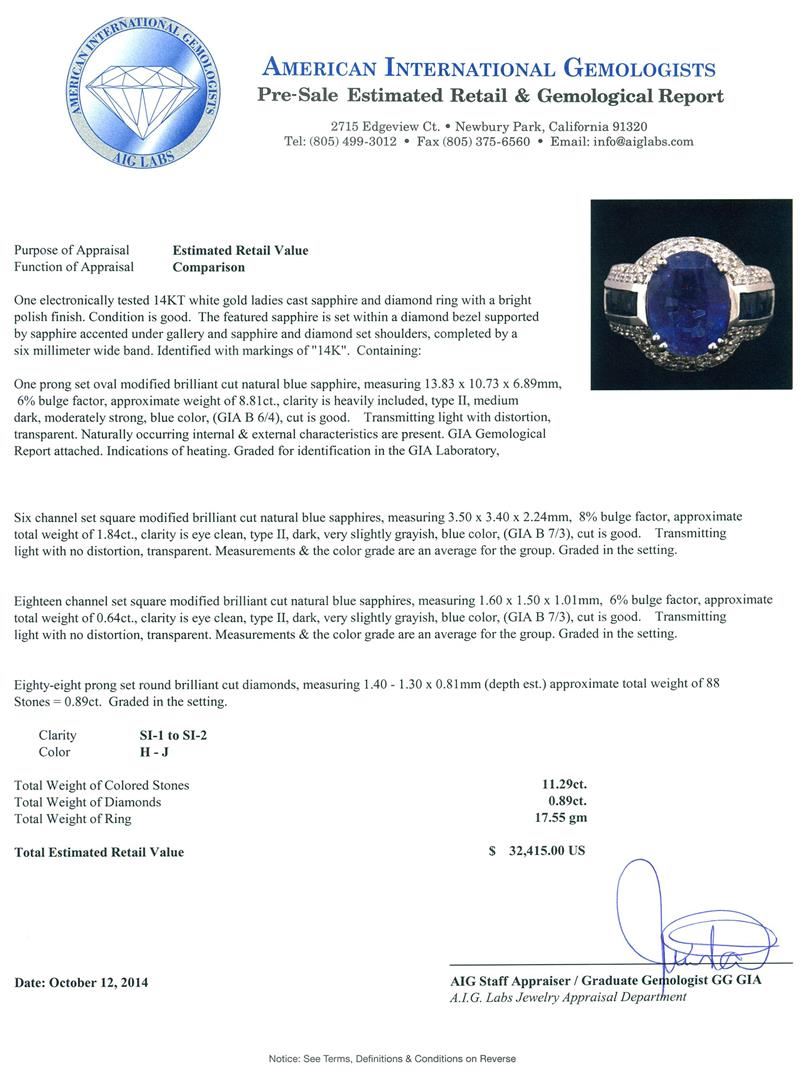 One electronically tested 14KT white gold lady's cast fashion ring with a wide band with a halo with a bright polish finish. The featured lady's ring has a shank measuring 6.06 millimeters wide. Identified with markings of '14K'. Condition is new, good workmanship. Containing: One prong set oval modified mixed cut natural blue sapphire, measuring 13.83 x 10.73 x 6.89mm, (depth est.) 15%. bulge factor, approximate weight of 10.04ct., clarity is moderately included, medium, moderately strong, blue color, (GIA B 5/4), cut is very good. Transmitting light somewhat diffusely, transparent to translucent. Indications of laboratory high temperature heat treatment. Graded in the GIA Laboratory, Report #1166617801. Six channel set square modified brilliant cut natural blue sapphires, measuring 3.90 x 3.50 x 2.41mm, (depth est.) approximate total weight of 1.95ct., clarity is eye clean, dark, moderately strong, blue color, (GIA B 7/4), cut is very good. Transmitting light with no distortion, transparent. Colored gemstones are presumed to have been subjected to commonly used enhancement processes. Graded in the setting. Seventeen channel set square modified brilliant cut natural blue sapphires, measuring 1.70 x 1.40 x 1.01mm, (depth est.) approximate total weight of 0.46ct., clarity is eye clean, dark, moderately strong, blue color, (GIA B 7/4), cut is very good. Transmitting light with no distortion, transparent. Colored gemstones are presumed to have been subjected to commonly used enhancement processes. Graded in the setting. Ninety prong set round brilliant cut diamonds, measuring 1.40 - 1.35 x 0.86mm (depth est.) approximate total weight of 90 Stones = 0.92ct. Graded in the setting. Color H - I Clarity SI-1 to I-1 Cut Good. Total Weight of Colored Stones 12.45ct.. Total Weight of Diamonds 0.92ct.. Total Weight of Ring 17.60gm GAS Appraised.