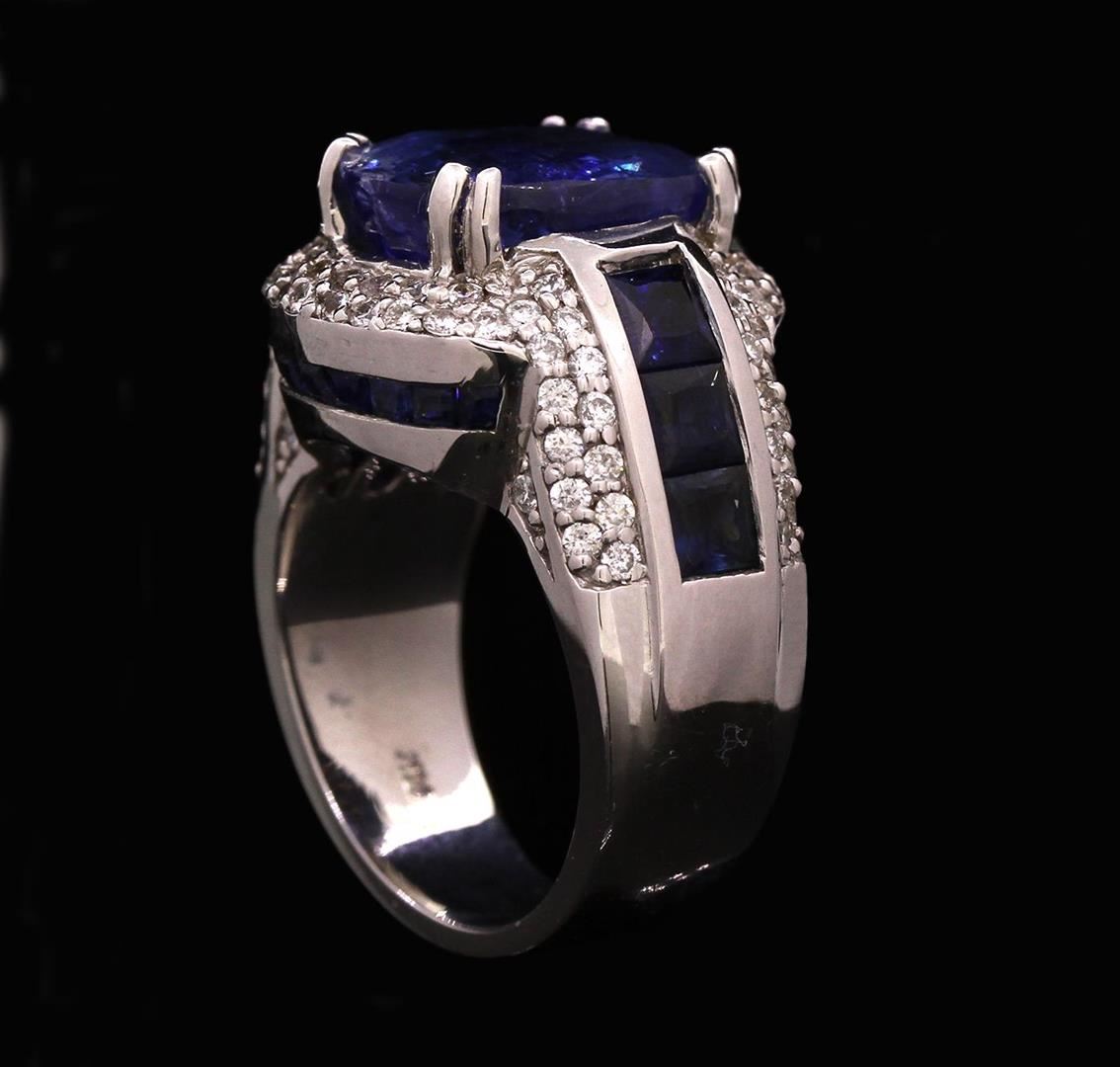 One electronically tested 14KT white gold lady's cast fashion ring with a wide band with a halo with a bright polish finish. The featured lady's ring has a shank measuring 6.06 millimeters wide. Identified with markings of '14K'. Condition is new, good workmanship. Containing: One prong set oval modified mixed cut natural blue sapphire, measuring 13.83 x 10.73 x 6.89mm, (depth est.) 15%. bulge factor, approximate weight of 10.04ct., clarity is moderately included, medium, moderately strong, blue color, (GIA B 5/4), cut is very good. Transmitting light somewhat diffusely, transparent to translucent. Indications of laboratory high temperature heat treatment. Graded in the GIA Laboratory, Report #1166617801. Six channel set square modified brilliant cut natural blue sapphires, measuring 3.90 x 3.50 x 2.41mm, (depth est.) approximate total weight of 1.95ct., clarity is eye clean, dark, moderately strong, blue color, (GIA B 7/4), cut is very good. Transmitting light with no distortion, transparent. Colored gemstones are presumed to have been subjected to commonly used enhancement processes. Graded in the setting. Seventeen channel set square modified brilliant cut natural blue sapphires, measuring 1.70 x 1.40 x 1.01mm, (depth est.) approximate total weight of 0.46ct., clarity is eye clean, dark, moderately strong, blue color, (GIA B 7/4), cut is very good. Transmitting light with no distortion, transparent. Colored gemstones are presumed to have been subjected to commonly used enhancement processes. Graded in the setting. Ninety prong set round brilliant cut diamonds, measuring 1.40 - 1.35 x 0.86mm (depth est.) approximate total weight of 90 Stones = 0.92ct. Graded in the setting. Color H - I Clarity SI-1 to I-1 Cut Good. Total Weight of Colored Stones 12.45ct.. Total Weight of Diamonds 0.92ct.. Total Weight of Ring 17.60gm GAS Appraised.