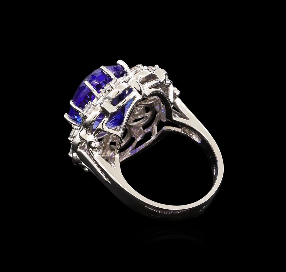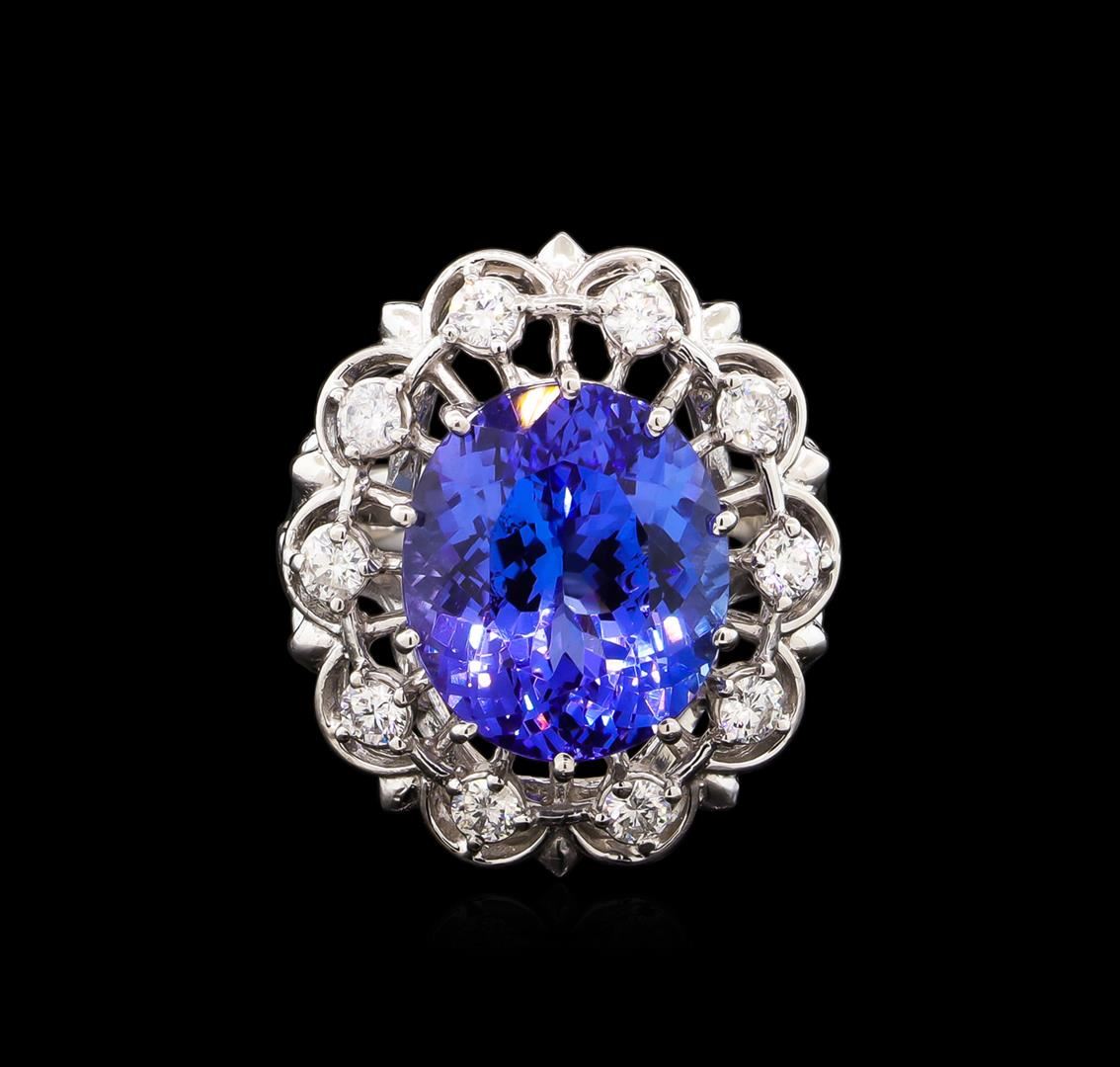 One electronically tested 14KT white gold lady's cast fashion ring with a basket halo with a bright polish finish. The featured lady's ring has a shank measuring 4.07 millimeters wide. Identified with markings of "K14". Condition is new, good workmanship. Containing: One prong set oval modified brilliant cut natural tanzanite, measuring 14.62 x 12.66 x 9.34mm, 3%. bulge factor, approximate weight of 12.45ct., clarity is eye clean, type I, medium dark, moderately strong, violetish blue color, (GIA vB 6/4), cut is very good. Transmitting light with no distortion, transparent. Colored gemstones are presumed to have been subjected to commonly used enhancement processes. Graded in the setting. Ten prong set round brilliant cut diamonds, measuring 2.80 - 2.70 x 1.68mm (depth est.) approximate total weight of 10 Stones = 0.77ct. Graded in the setting. Clarity: SI-1 to I-1. Color: G - I. Cut Good. Total Weight of Colored Stones 12.45ct. Total Weight of Diamonds 0.77ct. Total Weight of Ring 11.90gm. GAS Appraised at $25,530.00.