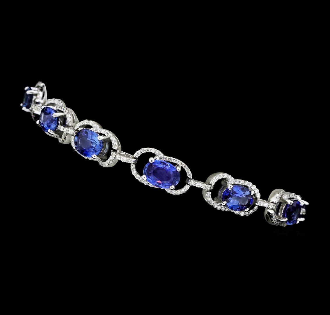 One electronically tested 14KT white gold lady's combination cast & assembled fashion bracelet with a tongue clasp with double foldover safeties with a bright polish finish. The featured lady's bracelet measures approximately 6.75 inches in length. Identified with markings of '14K'. Condition is new, good workmanship. Containing: Twelve prong set oval modified mixed cut natural blue sapphires, measuring 6.95 x 5.02 x 3.15mm, (depth est.) approximate total weight of 11.15ct., clarity is eye clean, medium light, moderately strong, blue color, (GIA B 4/4), cut is good. Transmitting light with no distortion, transparent. Colored gemstones are presumed to have been subjected to commonly used enhancement processes. Graded in the setting. Three Hundred Fifty-Two prong set round brilliant cut diamonds, measuring 1.05 - 0.95 x 0.62mm (depth est.) approximate total weight of 352 Stones = 1.31ct. Graded in the setting. Color G - H Clarity VS-2 to SI-1 Cut Very Good Total Weight of Colored Stones 11.15ct. Total Weight of Diamonds 1.31ct. Total Weight of Bracelet 13.10gm GAS Appraised at $18835.00. GAS Appraised.