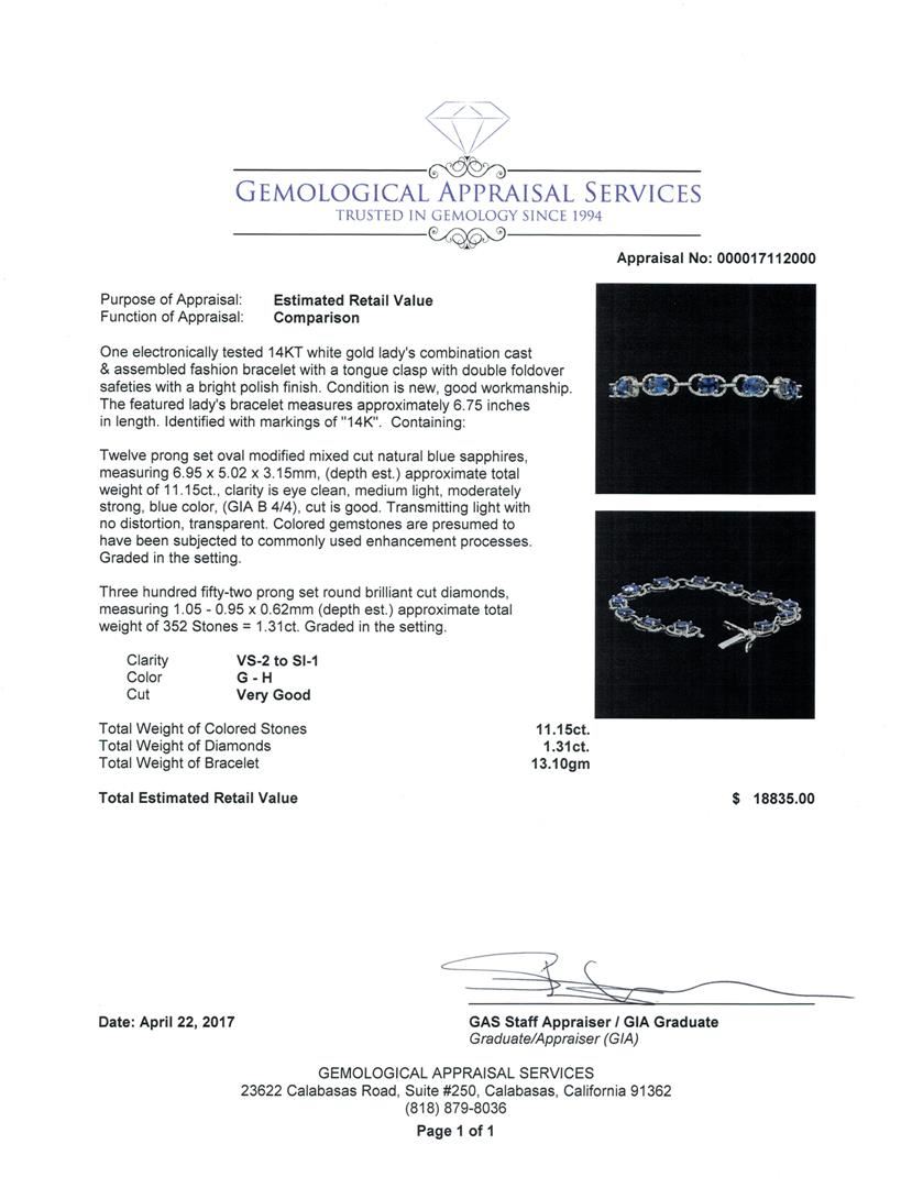 One electronically tested 14KT white gold lady's combination cast & assembled fashion bracelet with a tongue clasp with double foldover safeties with a bright polish finish. The featured lady's bracelet measures approximately 6.75 inches in length. Identified with markings of '14K'. Condition is new, good workmanship. Containing: Twelve prong set oval modified mixed cut natural blue sapphires, measuring 6.95 x 5.02 x 3.15mm, (depth est.) approximate total weight of 11.15ct., clarity is eye clean, medium light, moderately strong, blue color, (GIA B 4/4), cut is good. Transmitting light with no distortion, transparent. Colored gemstones are presumed to have been subjected to commonly used enhancement processes. Graded in the setting. Three Hundred Fifty-Two prong set round brilliant cut diamonds, measuring 1.05 - 0.95 x 0.62mm (depth est.) approximate total weight of 352 Stones = 1.31ct. Graded in the setting. Color G - H Clarity VS-2 to SI-1 Cut Very Good Total Weight of Colored Stones 11.15ct. Total Weight of Diamonds 1.31ct. Total Weight of Bracelet 13.10gm GAS Appraised at $18835.00. GAS Appraised.