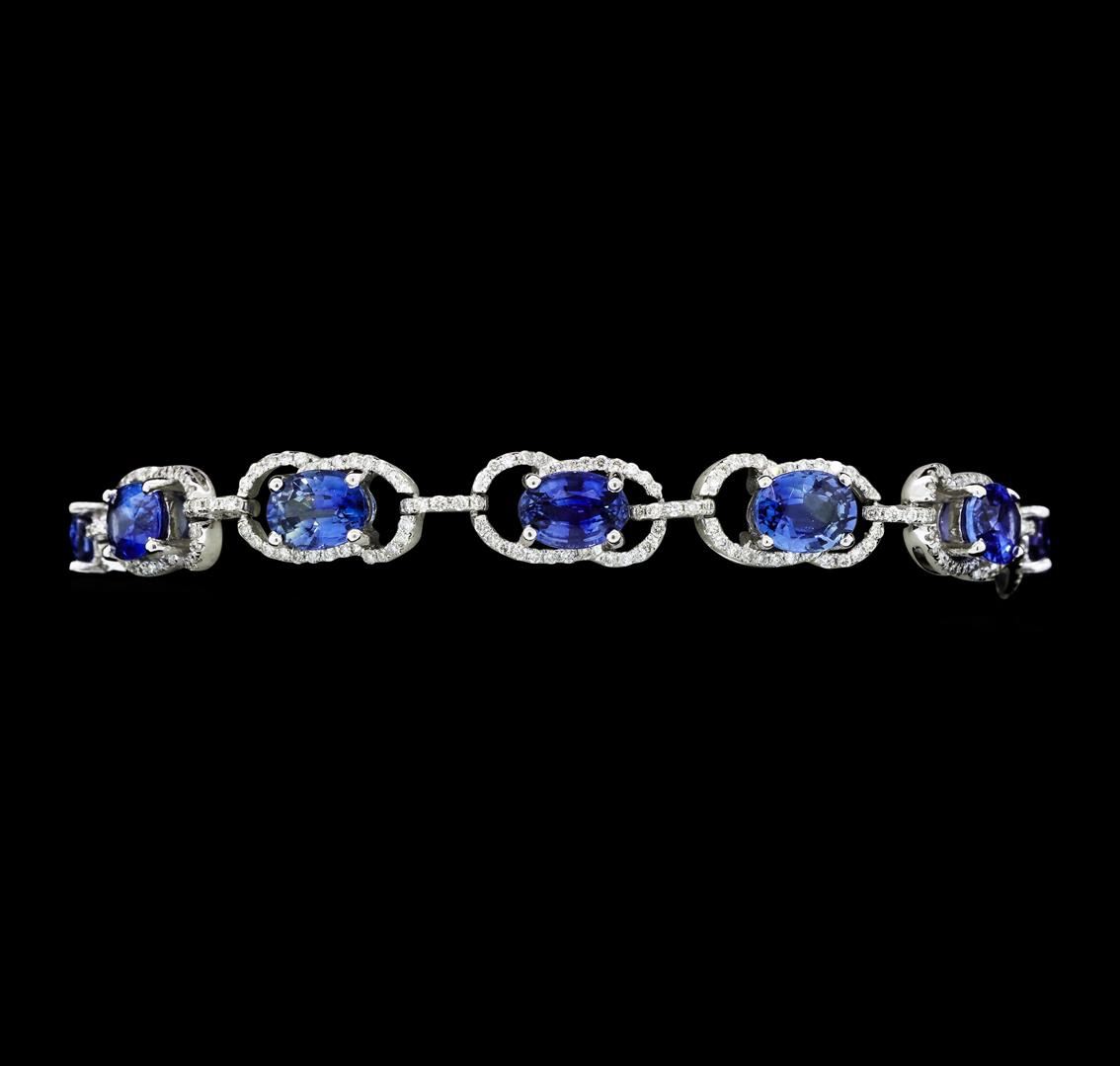 One electronically tested 14KT white gold lady's combination cast & assembled fashion bracelet with a tongue clasp with double foldover safeties with a bright polish finish. The featured lady's bracelet measures approximately 6.75 inches in length. Identified with markings of '14K'. Condition is new, good workmanship. Containing: Twelve prong set oval modified mixed cut natural blue sapphires, measuring 6.95 x 5.02 x 3.15mm, (depth est.) approximate total weight of 11.15ct., clarity is eye clean, medium light, moderately strong, blue color, (GIA B 4/4), cut is good. Transmitting light with no distortion, transparent. Colored gemstones are presumed to have been subjected to commonly used enhancement processes. Graded in the setting. Three Hundred Fifty-Two prong set round brilliant cut diamonds, measuring 1.05 - 0.95 x 0.62mm (depth est.) approximate total weight of 352 Stones = 1.31ct. Graded in the setting. Color G - H Clarity VS-2 to SI-1 Cut Very Good Total Weight of Colored Stones 11.15ct. Total Weight of Diamonds 1.31ct. Total Weight of Bracelet 13.10gm GAS Appraised at $18835.00. GAS Appraised.