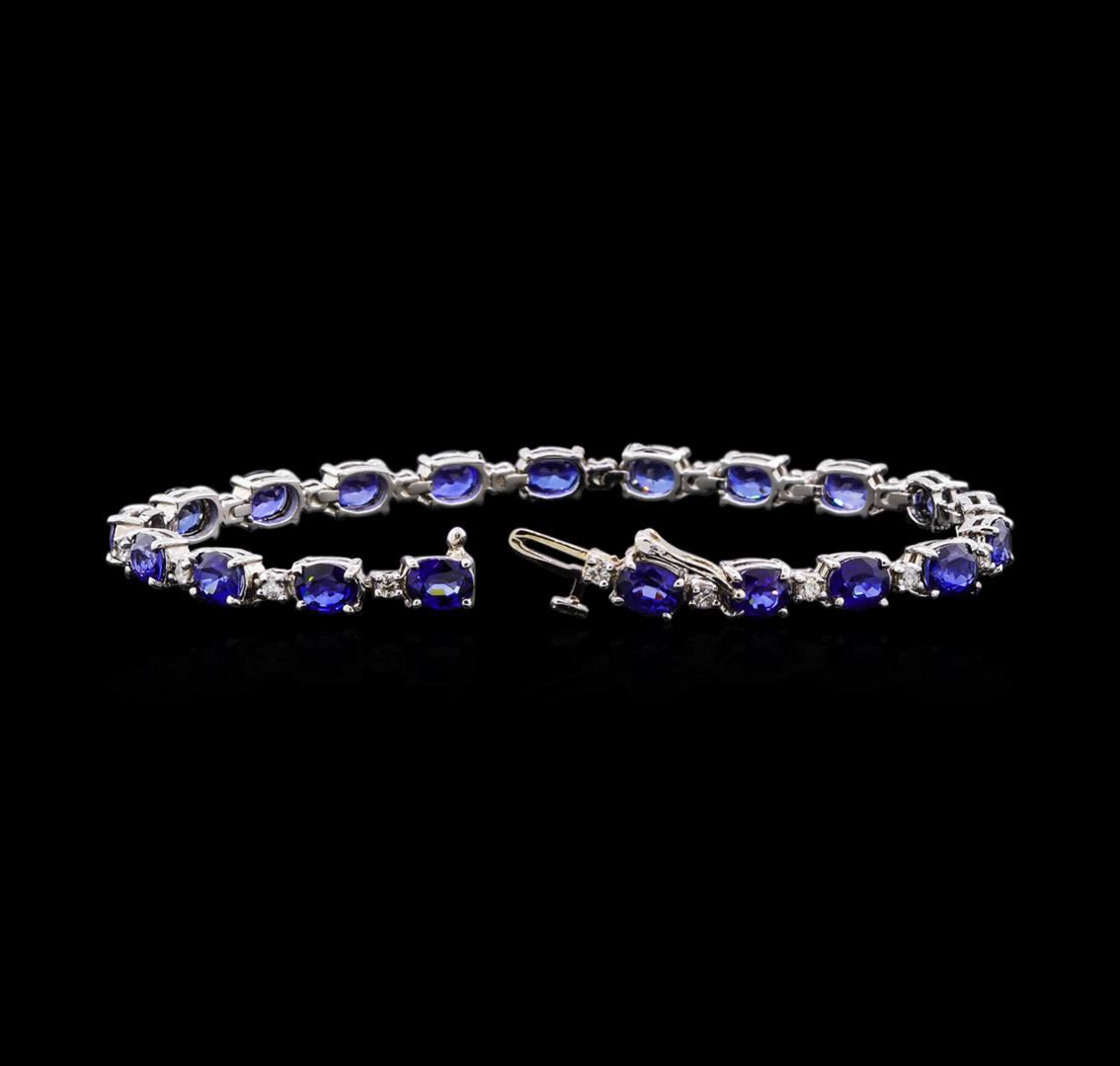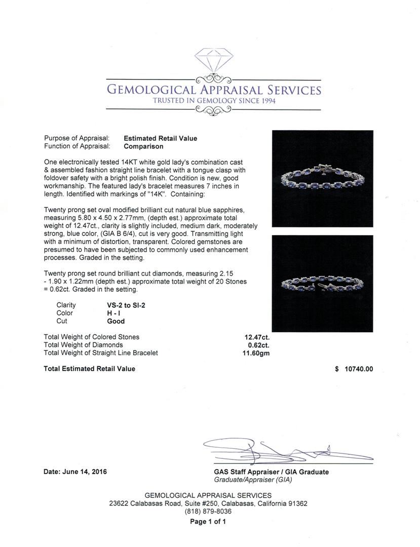 One electronically tested 14KT white gold lady's combination cast & assembled fashion straight line bracelet with a tongue clasp with foldover safety with a bright polish finish. The featured lady's bracelet measures 7 inches in length. Identified with markings of "14K". Condition is new, good workmanship. Containing: Twenty prong set oval modified brilliant cut natural blue sapphires, measuring 5.80 x 4.50 x 2.77mm, (depth est.) approximate total weight of 12.47ct., clarity is slightly included, medium dark, moderately strong, blue color, (GIA B 6/4), cut is very good. Transmitting light with a minimum of distortion, transparent. Colored gemstones are presumed to have been subjected to commonly used enhancement processes. Graded in the setting. Twenty prong set round brilliant cut diamonds, measuring 2.15 - 1.90 x 1.22mm (depth est.) approximate total weight of 20 Stones = 0.62ct. Graded in the setting. Clarity: VS-2 to SI-2. Color: H - I. Cut Good. Total Weight of Colored Stones 12.47ct. Total Weight of Diamonds 0.62ct. Total Weight of Straight Line Bracelet 11.60gm. GAS Appraised at $10,740.00.