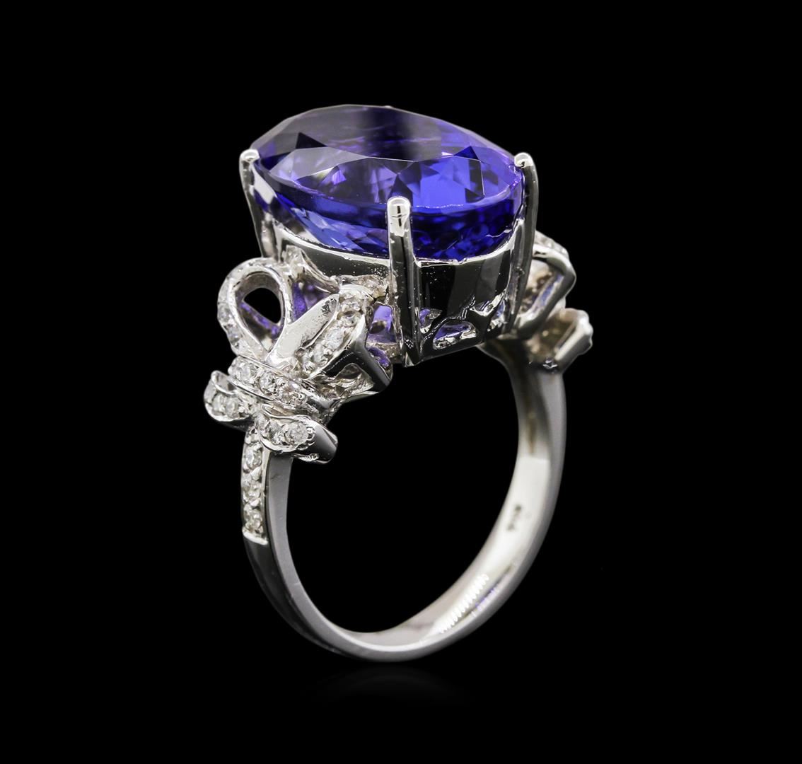 One electronically tested 14KT white gold lady's cast fashion ring with a cathedral shank with a bright polish finish. The featured ring has a 3.00mm shank. Identified with markings of "K14". Condition is new, good workmanship. Containing: One prong set oval modified brilliant cut natural tanzanite, measuring 16.65 x 11.40 x 8.40mm, 10% bulge factor, approximate weight of 12.47ct., clarity is eye clean, type I, dark, very slightly grayish, violet color, (GIA V 7/3), cut is very good. Transmitting light with no distortion, transparent. Colored gemstones are presumed to have been subjected to commonly used enhancement processes. Graded in the setting. Forty-Eight bead set round brilliant cut diamonds, measuring 1.30 - 1.25 x 0.77mm (depth est.) approximate total weight of 48 Stones = 0.37ct. Graded in the setting. Clarity: SI-1 to I-1. Color: H - I. Cut Good. Total Weight of Colored Stones 12.47ct. Total Weight of Diamonds 0.37ct. Total Weight of Ring 9.40gm. GAS Appraised at $29,490.00.