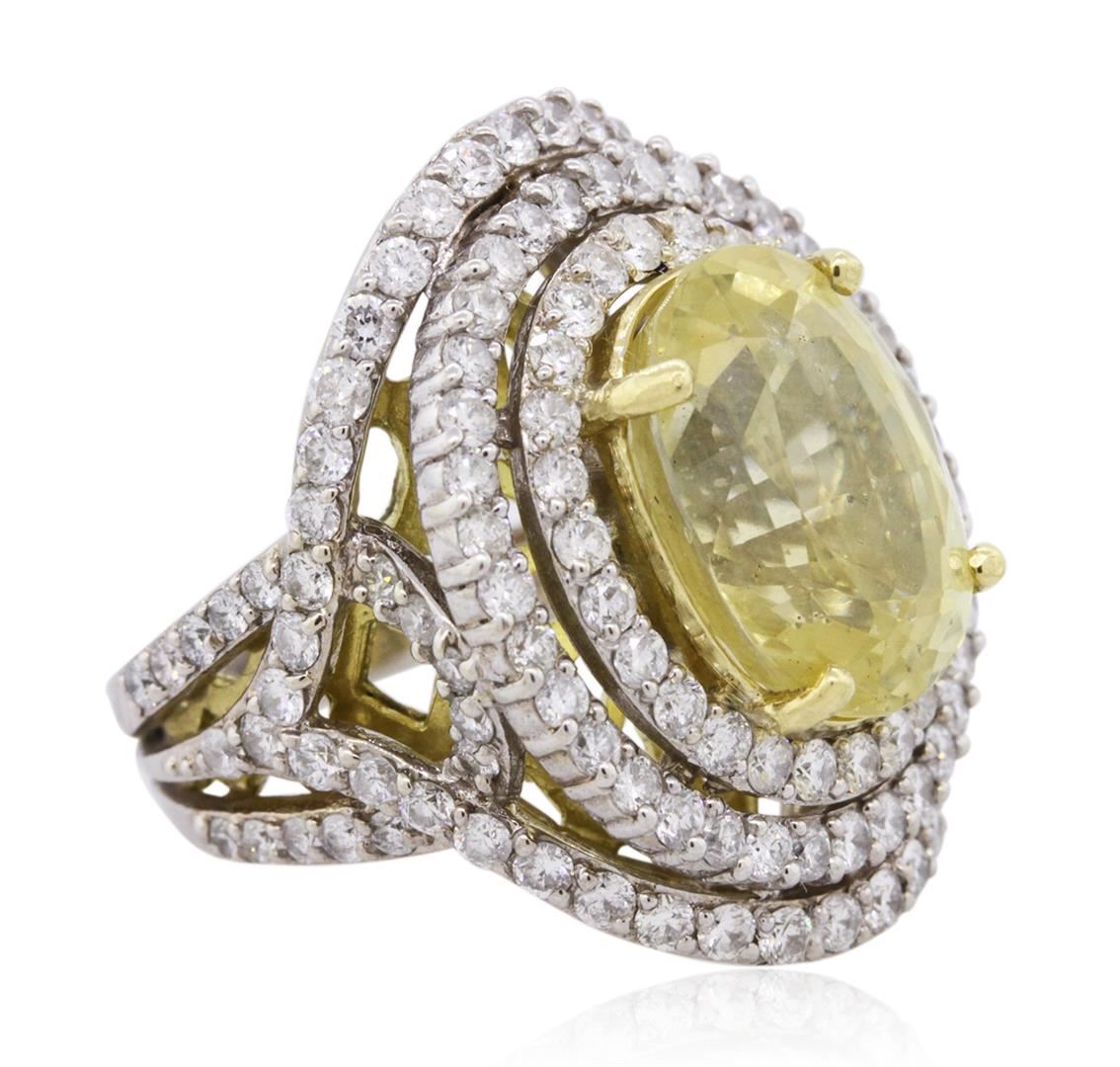 One electronically tested 18KT white and yellow gold ladies cast yellow sapphire and diamond ring with a bright polish finish. The featured yellow sapphire is set within tiered diamond bezels supported by elaborate diamond set shoulders, completed by a three and one-half millimeter wide band. Identified with markings of "18K". Condition is new, good workmanship. Containing: One prong set oval mixed cut natural yellow sapphire, measuring 15.15 x 11.30 x 8.41mm, 6%. bulge factor, approximate weight of 12.47ct., clarity is slightly included, type II, medium, moderately strong, yellow color, (GIA Y 5/4), cut is good. Transmitting light with a minimum of distortion, transparent. Naturally occurring internal & external characteristics are present. No indications of heating. GIA Gemological Report attached. Graded in the GIA Laboratory, Report #2161013250.One Hundred Thirty-Eight prong set round brilliant cut diamonds, measuring 2.00 - 1.80 x 1.14mm (depth est.) approximate total weight of 138 Stones = 3.56ct. Graded in the setting. Clarity: SI-1 to I-1. Color: G - I. Total Weight of Colored Stones 12.47ct. Total Weight of Diamonds 3.56ct. Total Weight of Ring 19.90 grams. AIG Appraised at $76,525.00.