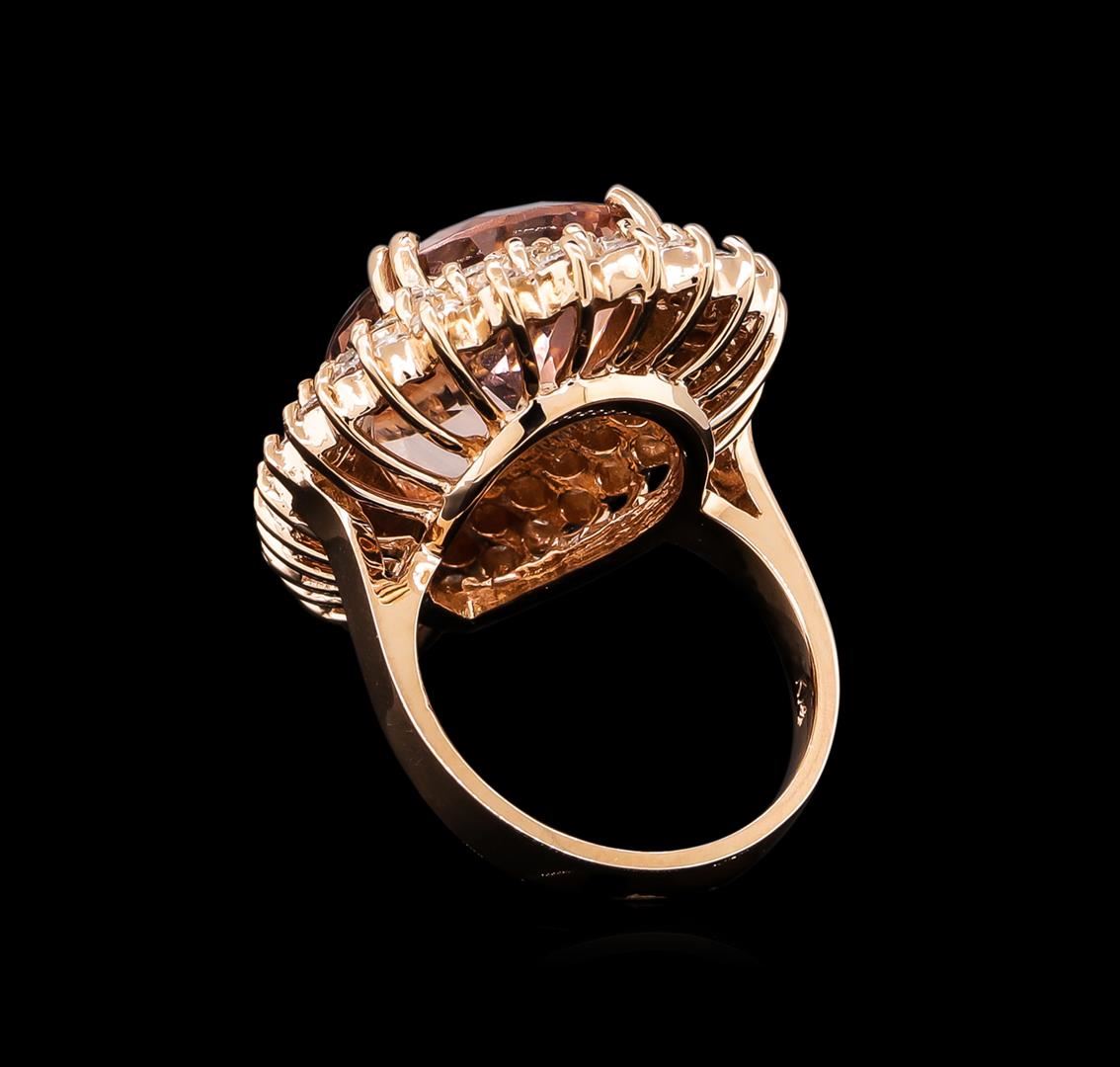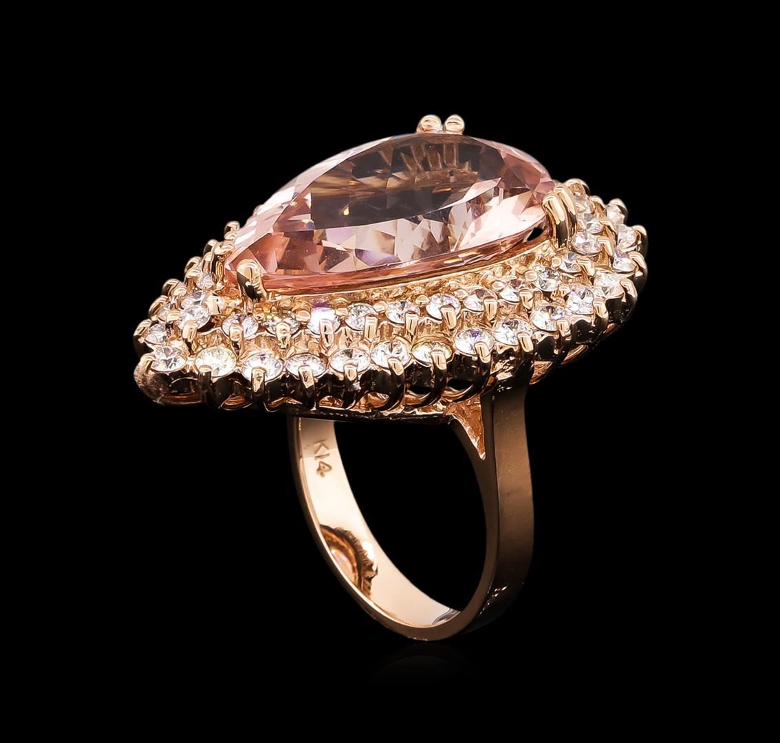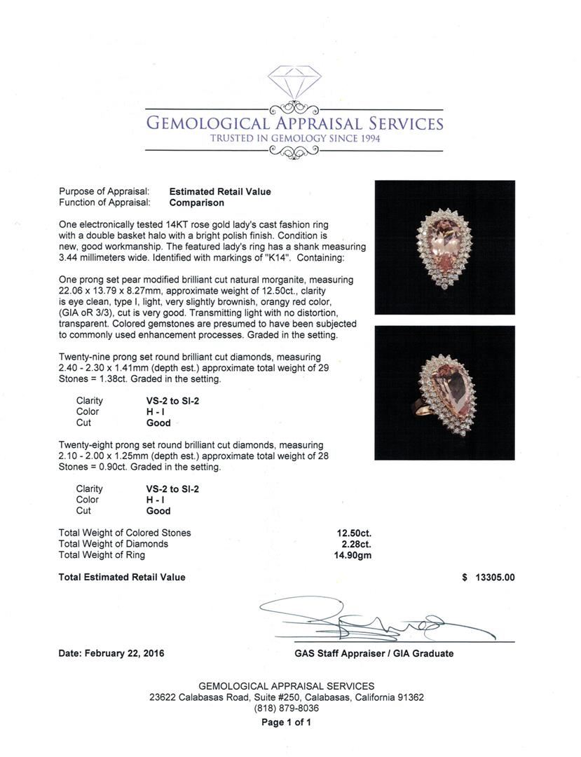 One electronically tested 14KT rose gold lady's cast fashion ring with a double basket halo with a bright polish finish. The featured lady's ring has a shank measuring 3.44 millimeters wide. Identified with markings of "K14". Condition is new, good workmanship. Containing: One prong set pear modified brilliant cut natural morganite, measuring 22.06 x 13.79 x 8.27mm, approximate weight of 12.50ct., clarity is eye clean, type I, light, very slightly brownish, orangy red color, (GIA oR 3/3), cut is very good. Transmitting light with no distortion, transparent. Colored gemstones are presumed to have been subjected to commonly used enhancement processes. Graded in the setting. Twenty-Nine prong set round brilliant cut diamonds, measuring 2.40 - 2.30 x 1.41mm (depth est.) approximate total weight of 29 Stones = 1.38ct. Graded in the setting. Clarity: VS-2 to SI-2. Color: H - I. Cut Good Twenty-Eight prong set round brilliant cut diamonds, measuring 2.10 - 2.00 x 1.25mm (depth est.) approximate total weight of 28 Stones = 0.90ct. Graded in the setting. Clarity: VS-2 to SI-2. Color: H - I. Cut Good. Total Weight of Colored Stones 12.50ct. Total Weight of Diamonds 2.28ct. Total Weight of Ring 14.90gm. GAS Appraised at $13,305.00.